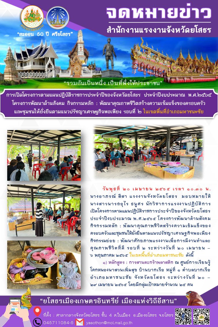 การเปิดโครงการตามแผนปฏิบัติราชการประจำปีของจังหวัดยโสธร ประจำปีงบประมาณ พ.ศ.๒๕๖๕ โครงการพัฒนาด้านสังคม กิจกรรมหลัก : พัฒนาคุณภาพชีวิตสร้างความเข้มแข็งของครอบครัวและชุมชนให้ยั่งยืนตามแนวปรัชญาเศรษฐกิจพอเพียง รอบที่ ๒ ในเขตพื้นที่อำเภอมหาชนะชัย