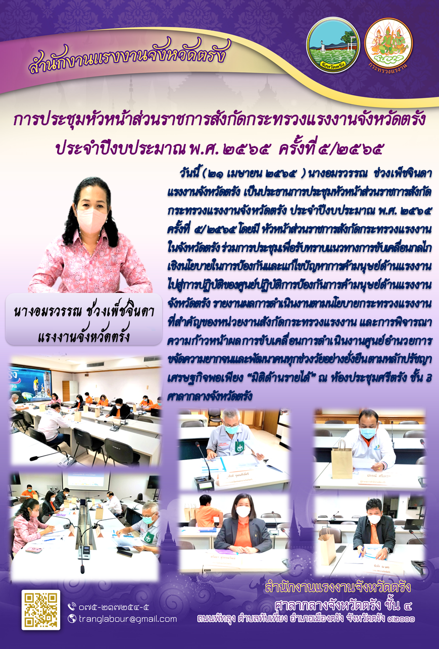 แรงงานจังหวัดตรัง เป็นประธานการประชุมหัวหน้าส่วนราชการสังกัดกระทรวงแรงงานจังหวัดตรัง ประจำปีงบประมาณ พ.ศ. ๒๕๖๕ ครั้งที่ ๕/ ๒๕๖๕