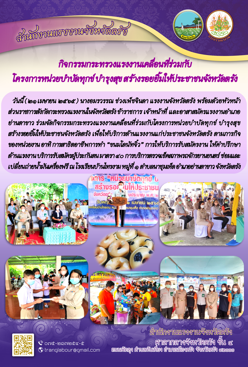 แรงงานจังหวัดตรัง พร้อมด้วยหัวหน้าส่วนราชการสังกัดกระทรวงแรงงานในจังหวัดตรัง ร่วมกิจกรรมกระทรวงแรงงานเคลื่อนที่ร่วมกับ โครงการหน่วยบำบัดทุกข์ บำรุงสุข สร้างรอยยิ้มให้ประชาชนจังหวัดตรัง