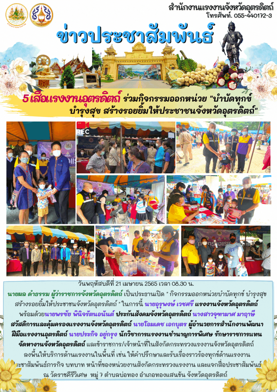 5 เสือแรงงานอุตรดิตถ์ ร่วมกิจกรรมออกหน่วย “บำบัดทุกข์ บำรุงสุข สร้างรอยยิ้มให้ประชาชนจังหวัดอุตรดิตถ์”