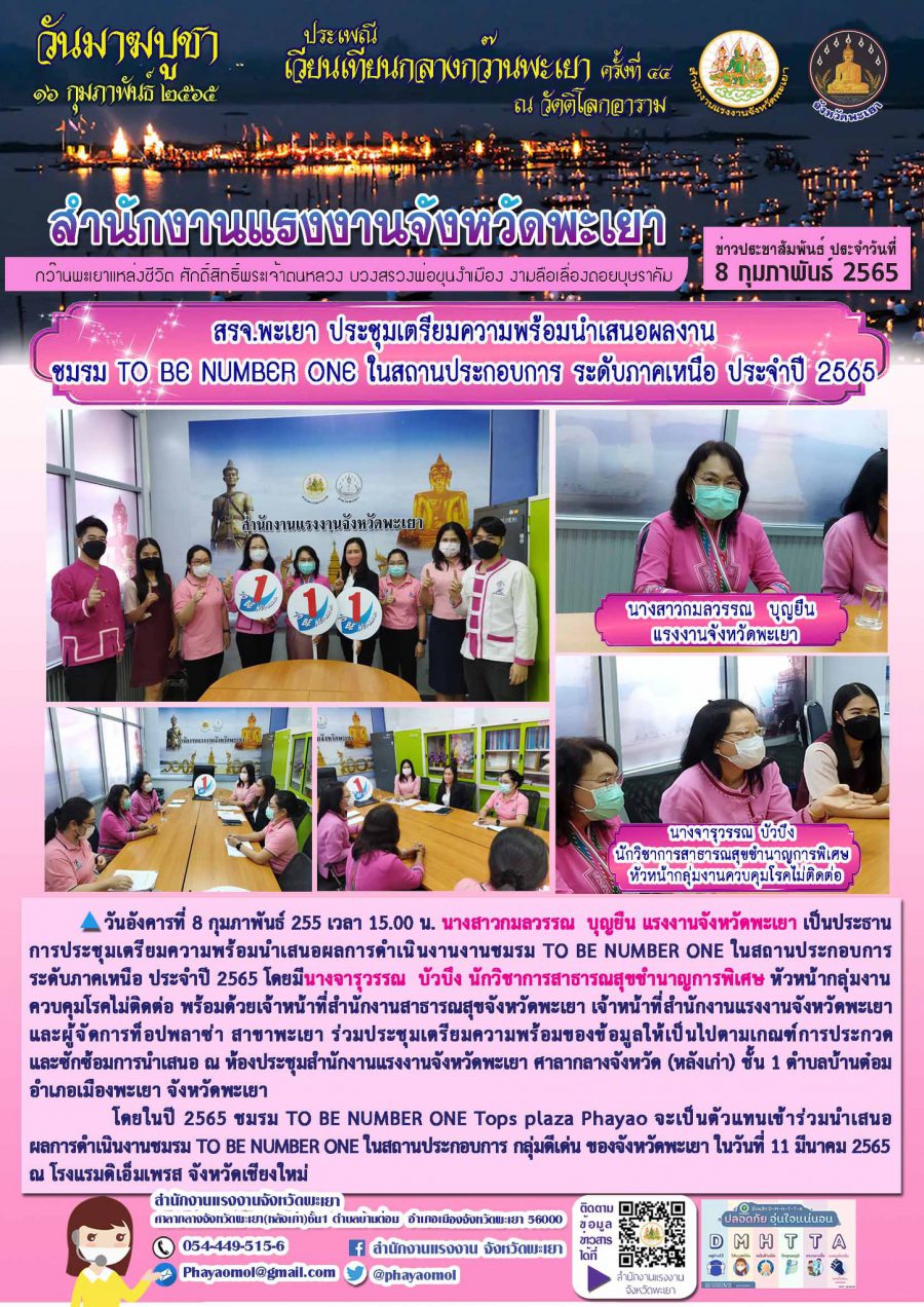 สรจ.พะเยา ประชุมเตรียมความพร้อมนำเสนอผลงานชมรม TO BE NUMBER ONE ในสถานประกอบการ ระดับภาคเหนือ ประจำปี 2565