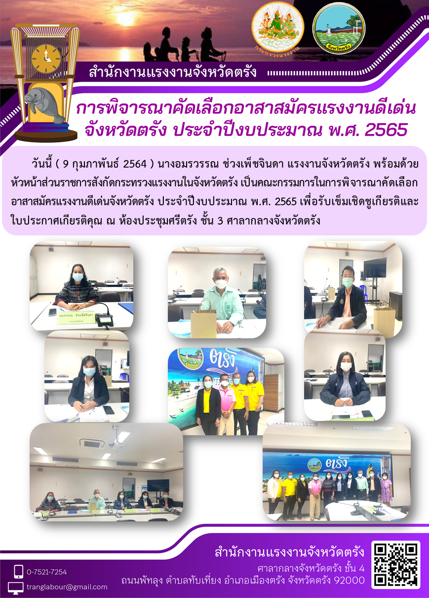 แรงงานจังหวัดตรัง เป็นคณะกรรมการในการพิจารณาคัดเลือกอาสาสมัครแรงงานดีเด่นจังหวัดตรัง ประจำปีงบประมาณ พ.ศ. 2565