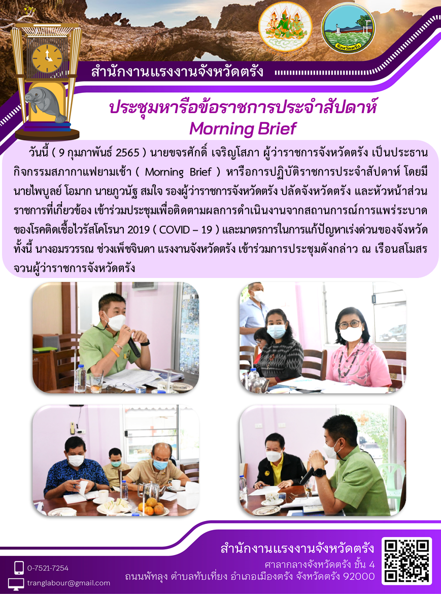 แรงงานจังหวัดตรัง ร่วมกิจกรรมสภากาแฟยามเช้า (Morning Brief) หารือการปฏิบัติราชการประจำสัปดาห์