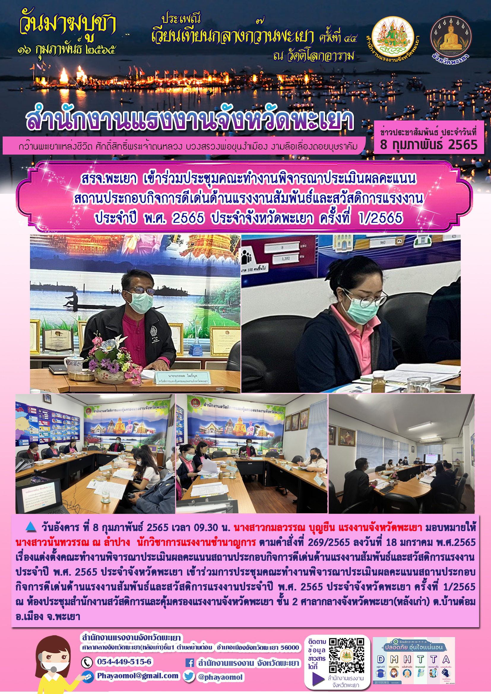 สรจ.พะเยา เข้าร่วมประชุมคณะทำงานพิจารณาประเมินผลคะแนนสถานประกอบกิจการดีเด่นด้านแรงงานสัมพันธ์และสวัสดิการแรงงานประจำปี พ.ศ. 2565 ประจำจังหวัดพะเยา ครั้งที่ 1/2565