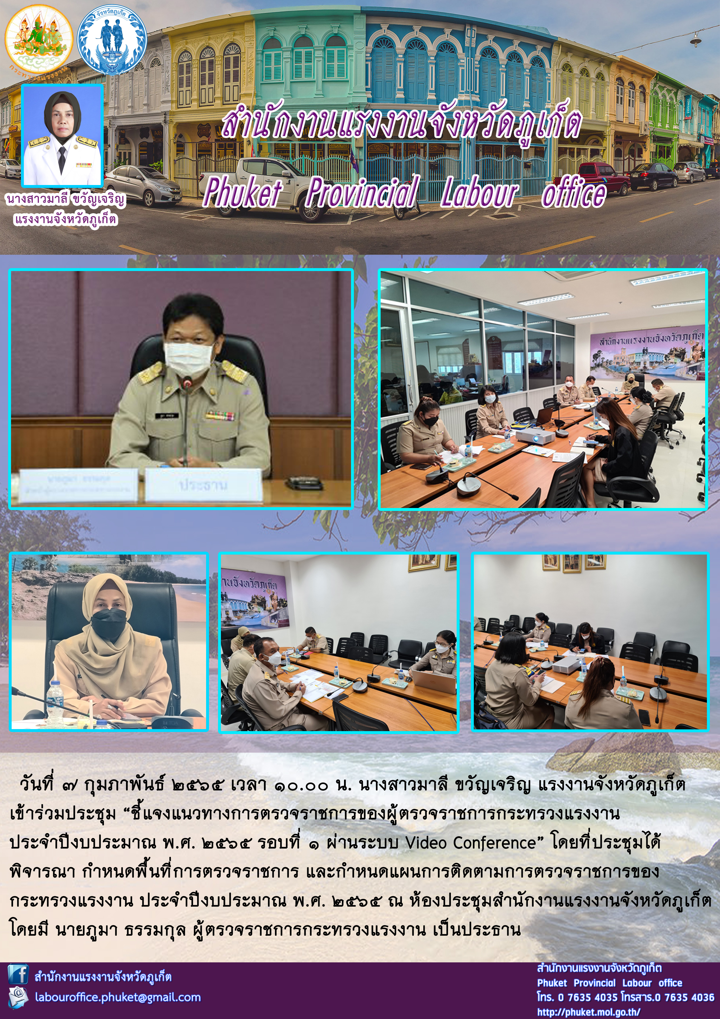 แรงงานจังหวัดภูเก็ต เข้าร่วมประชุม “ชี้แจงแนวทางการตรวจราชการของผู้ตรวจราชการกระทรวงแรงงาน ประจำปีงบประมาณ พ.ศ. 2565 รอบที่ 1 ผ่านระบบ Video Conference”