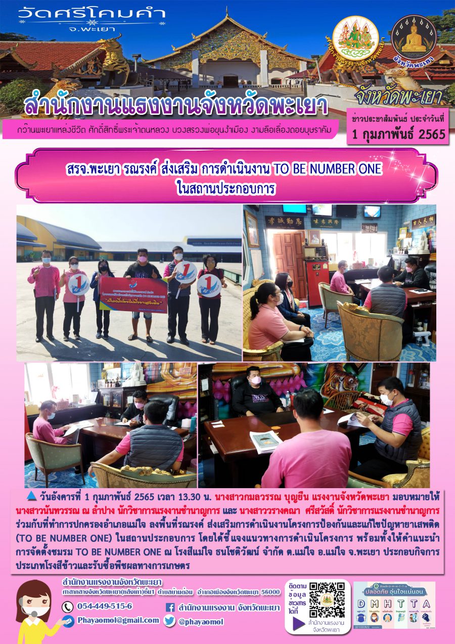สรจ.พะเยา รณรงค์ ส่งเสริม การดำเนินงาน TO BE NUMBER ONE ในสถานประกอบการ