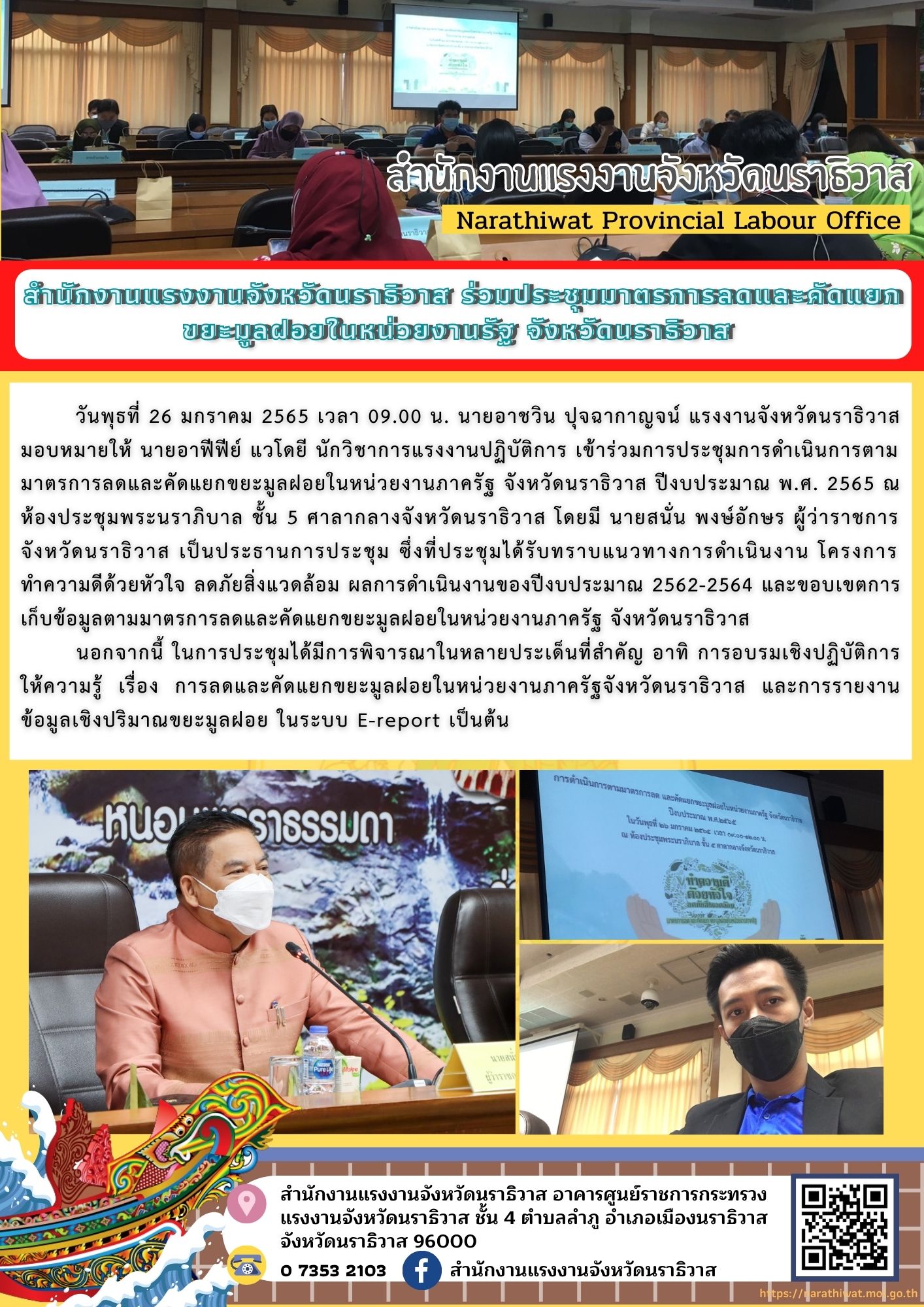 สำนักงานแรงงานจังหวัดนราธิวาส ร่วมประชุมมาตรการลดและคัดแยกขยะมูลฝอยในหน่วยงานรัฐ จังหวัดนราธิวาส