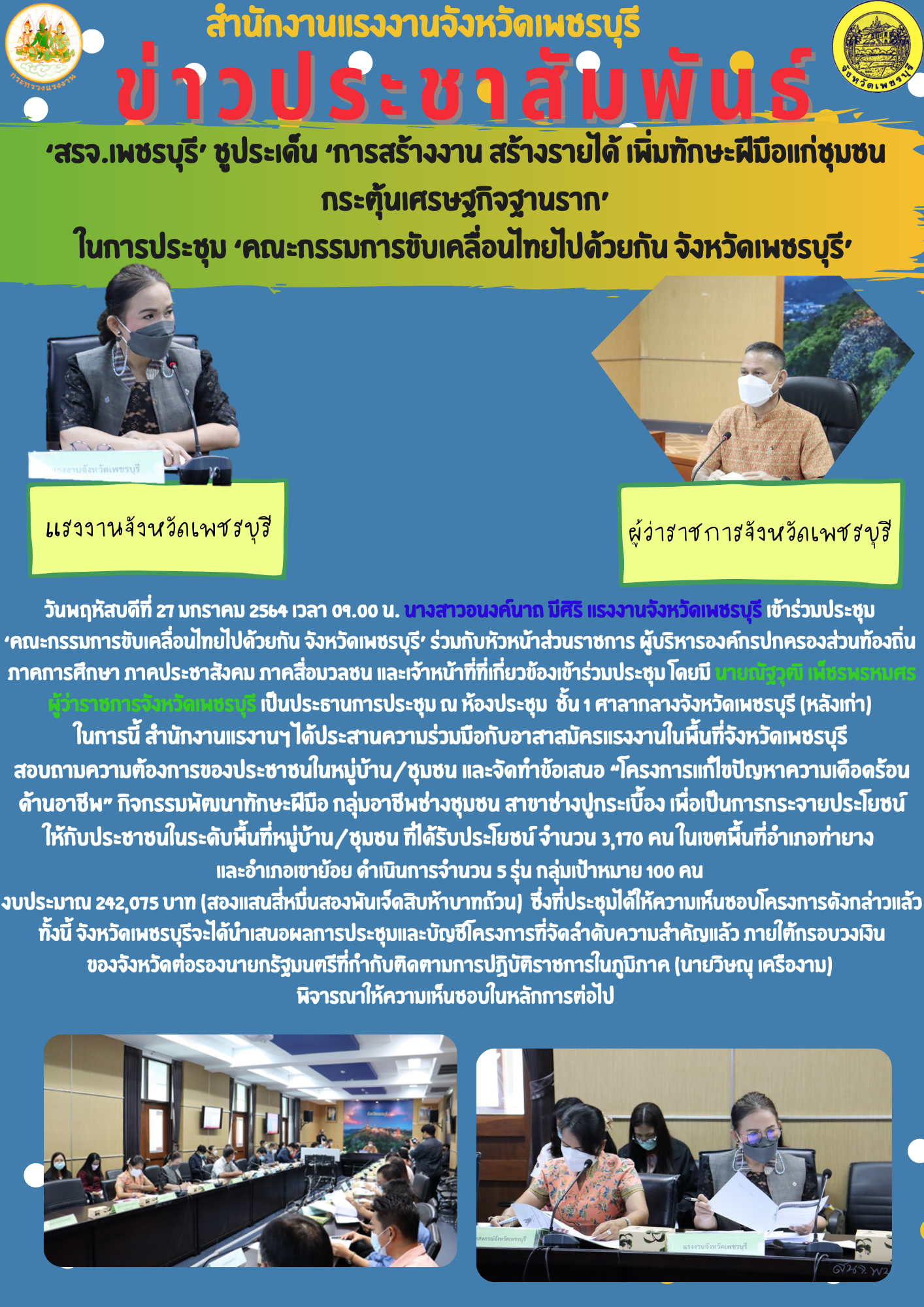‘สรจ.เพชรบุรี’ ชูประเด็น ‘การสร้างงาน สร้างรายได้ เพิ่มทักษะฝีมือแก่ชุมชน กระตุ้นเศรษฐกิจฐานราก’ ในการประชุม ‘คณะกรรมการขับเคลื่อนไทยไปด้วยกัน จังหวัดเพชรบุรี’
