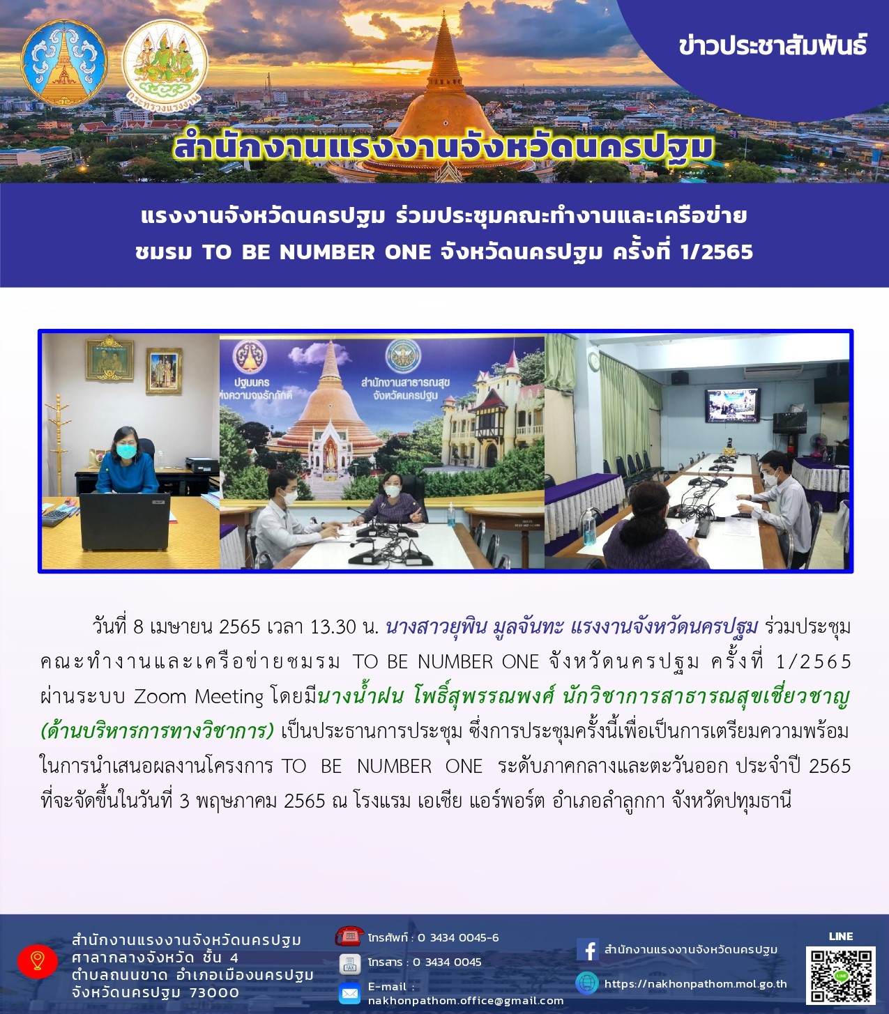 แรงงานจังหวัดนครปฐม ร่วมประชุมคณะทำงานและเครือข่ายชมรม TO BE NUMBER ONE จังหวัดนครปฐม ครั้งที่ 1/2565