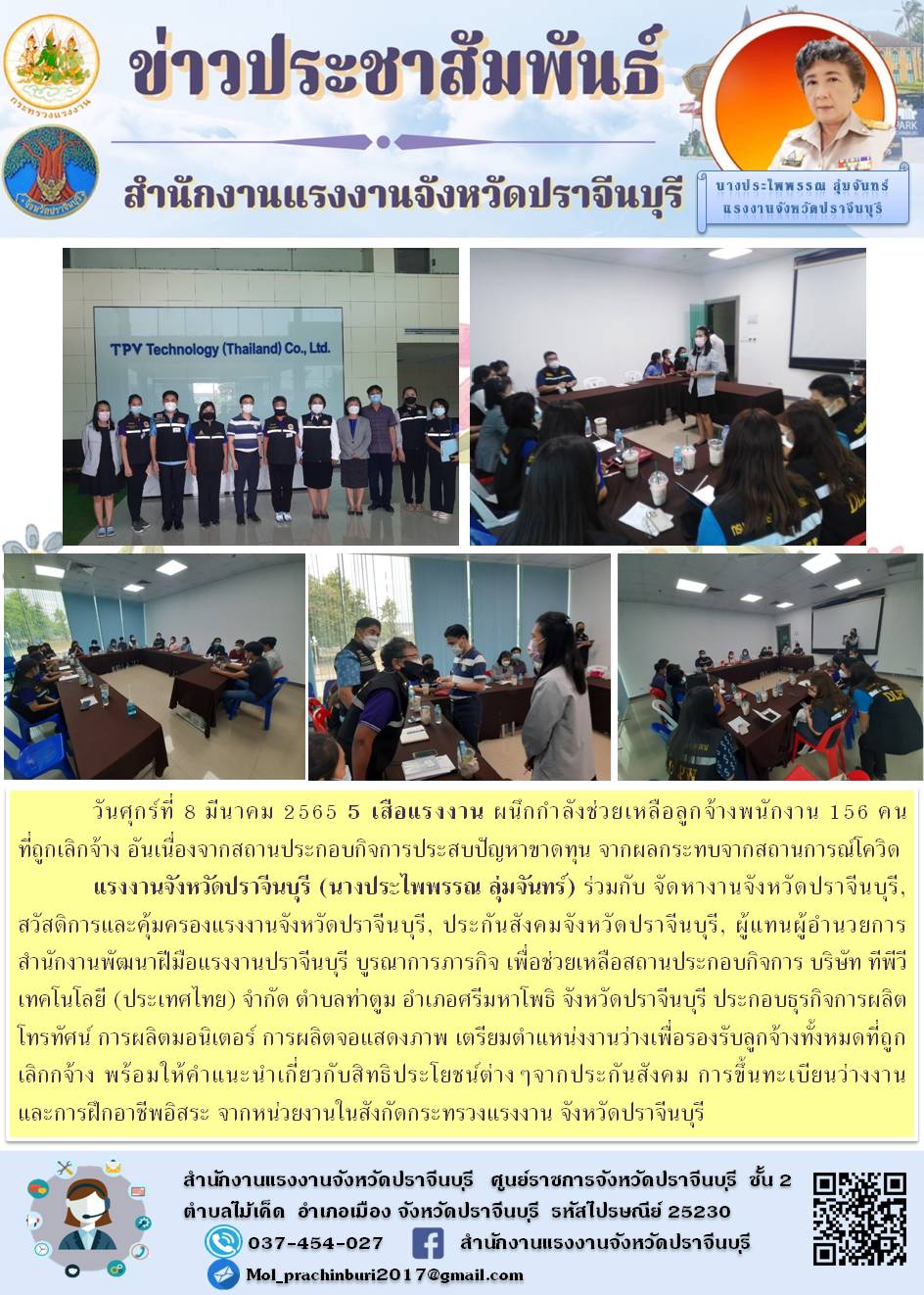 แรงงานจังหวัดปราจีนบุรี (นางประไพพรรณ ลุ่มจันทร์) ร่วมกับ 5 เสือแรงงาน ผนึกกำลังช่วยเหลือลูกจ้างพนักงาน 156 คน ที่ถูกเลิกจ้าง อันเนื่องจากสถานประกอบกิจการประสบปัญหาขาดทุน จากผลกระทบจากสถานการณ์โควิด