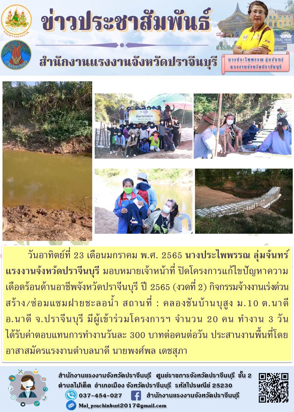 สรจ.ปราจีนบุรี ปิดโครงการแก้ไขปัญหาความเดือดร้อนด้านอาชีพจังหวัดปราจีนบุรี ปี 2565 (งวดที่ 2) กิจกรรมจ้างงานเร่งด่วน สร้าง/ซ่อมแซมฝายชะลอน้ำ