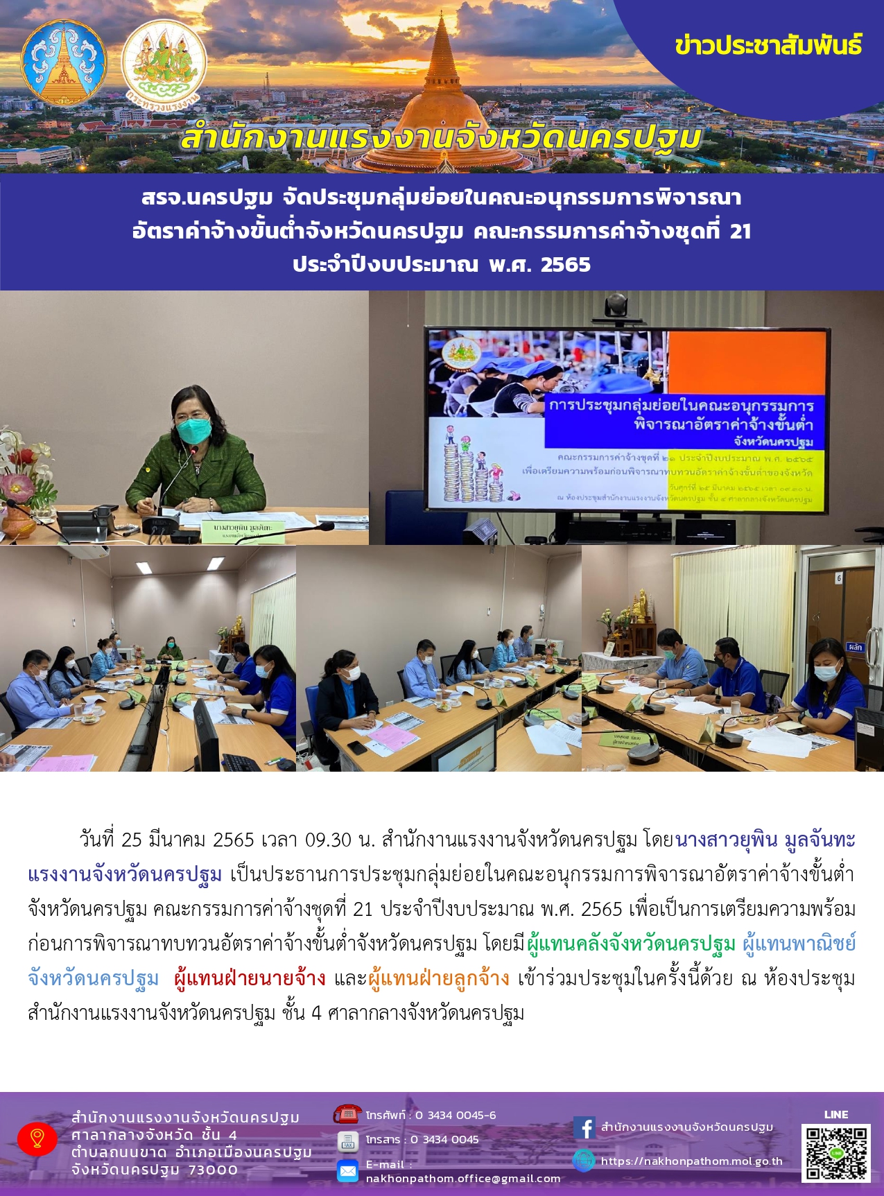 สรจ.นครปฐม จัดประชุมกลุ่มย่อยในคณะอนุกรรมการพิจารณาอัตราค่าจ้างขั้นต่ำจังหวัดนครปฐม คณะกรรมการค่าจ้างชุดที่ 21 ประจำปีงบประมาณ พ.ศ. 2565