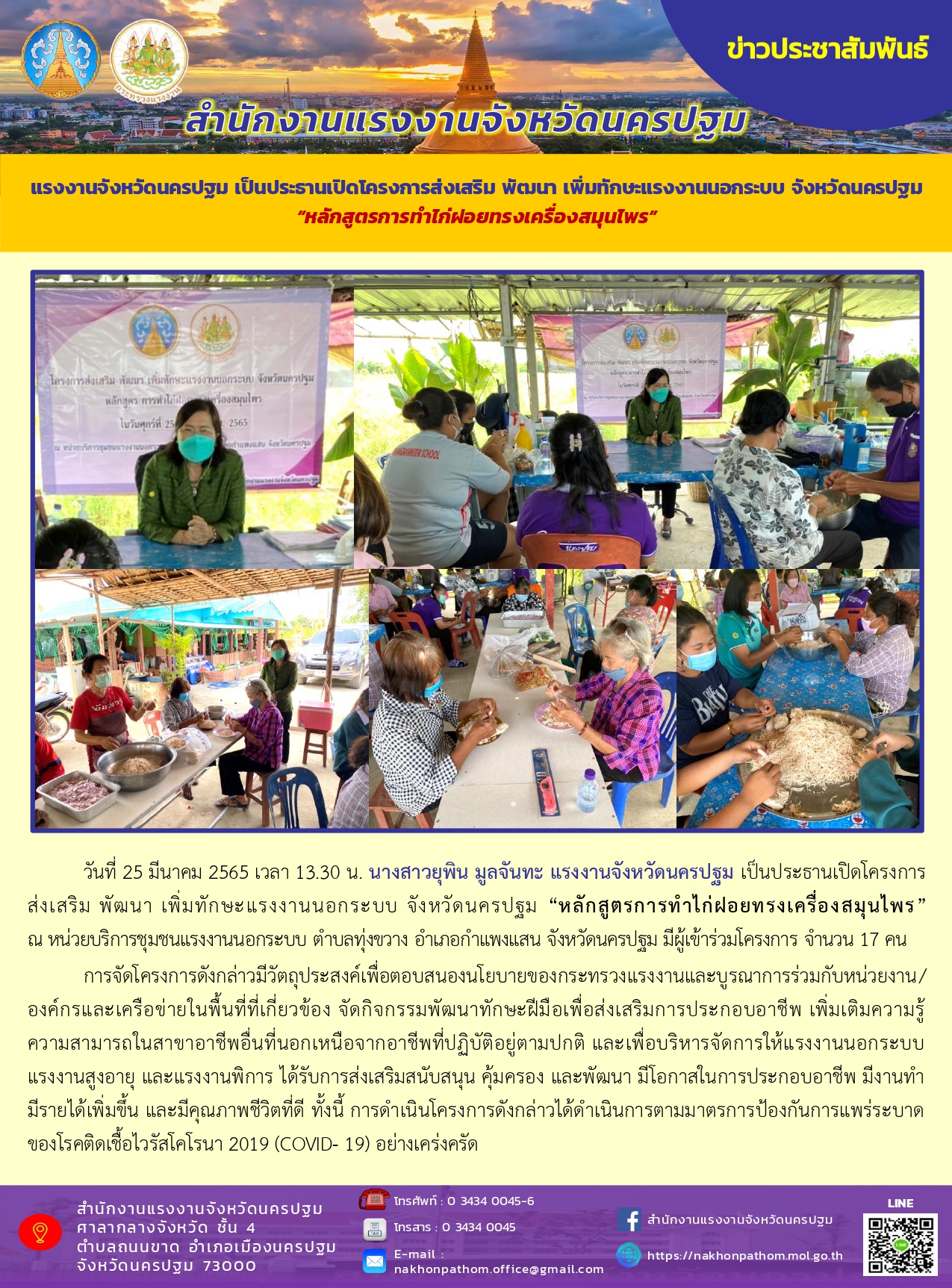 แรงงานจังหวัดนครปฐม เป็นประธานเปิดโครงการส่งเสริม พัฒนา เพิ่มทักษะแรงงานนอกระบบ จังหวัดนครปฐม หลักสูตรการทำไก่ฝอยทรงเครื่องสมุนไพร