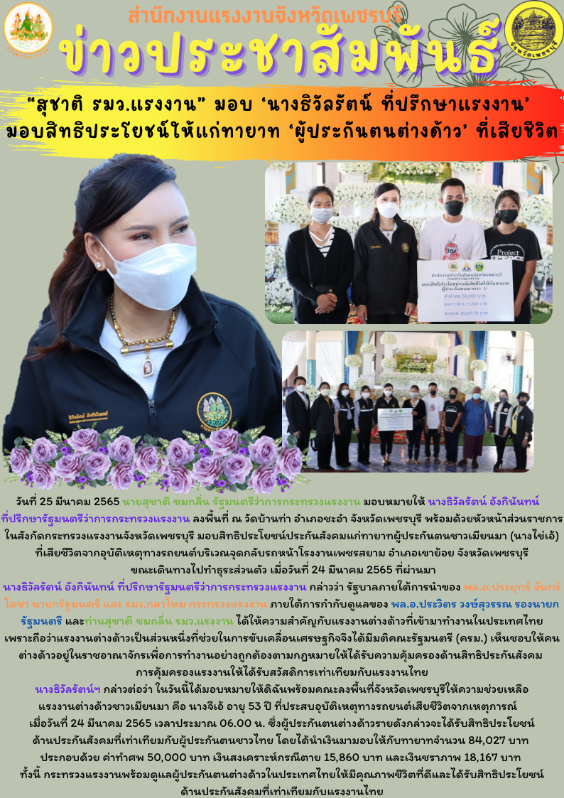 “สุชาติ รมว.แรงงาน” มอบ ‘นางธิวัลรัตน์ ที่ปรึกษาแรงงาน’ มอบสิทธิประโยชน์ให้แก่ทายาท ‘ผู้ประกันตนต่างด้าว’ ที่เสียชีวิต