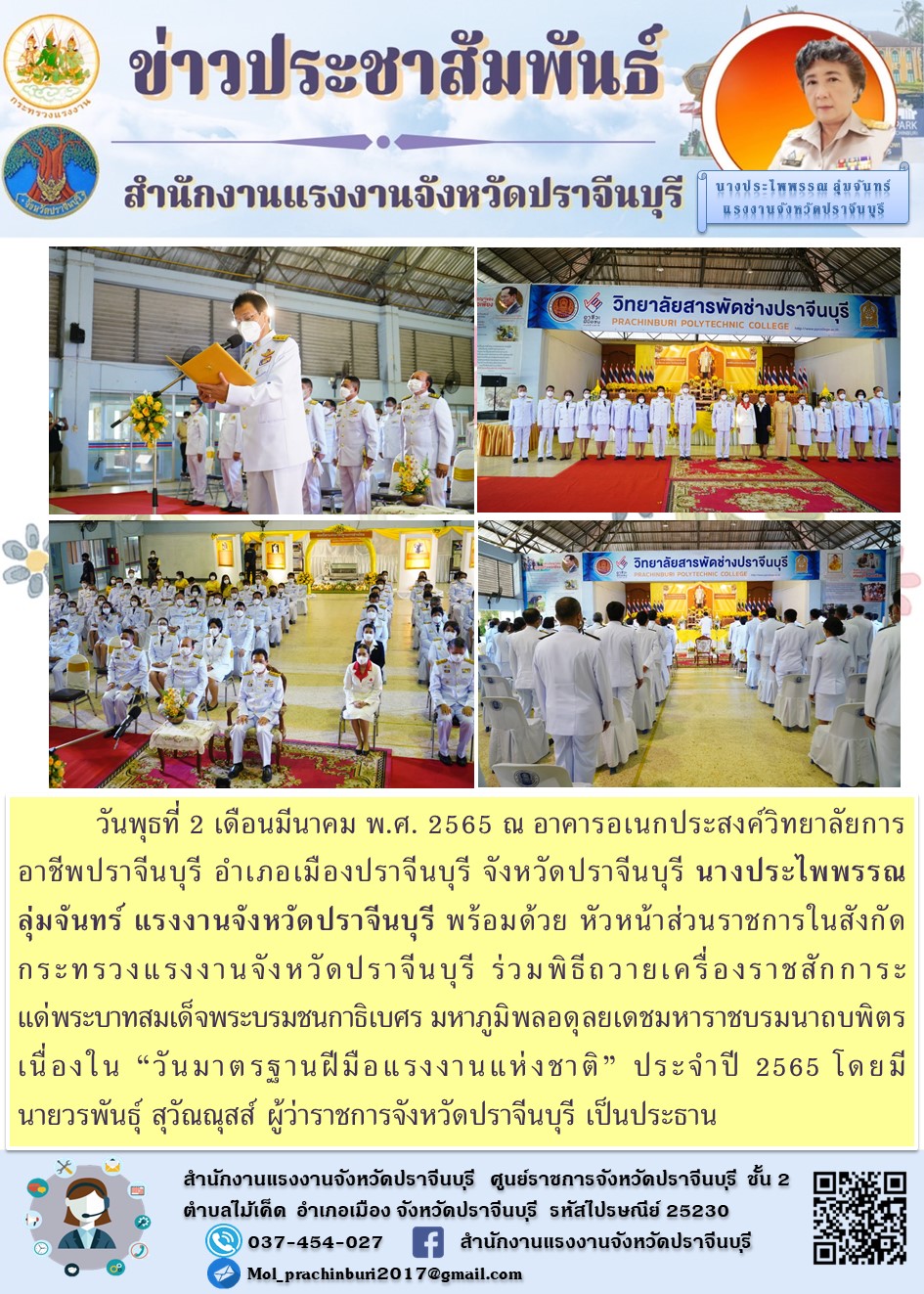 แรงงานจังหวัดปราจีนบุรี ร่วมพิธีถวายเครื่องราชสักการะ แด่พระบาทสมเด็จพระบรมชนกาธิเบศร มหาภูมิพลอดุลยเดชมหาราชบรมนาถบพิตร เนื่องใน “วันมาตรฐานฝีมือแรงงานแห่งชาติ” ประจำปี 2565
