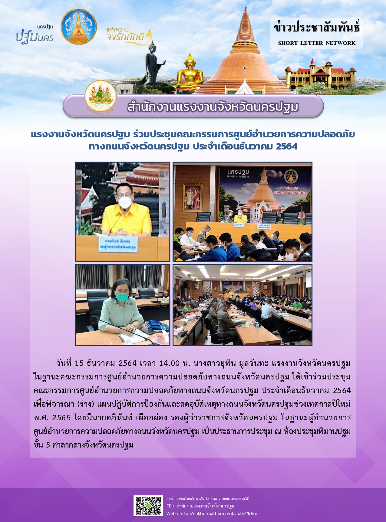 แรงงานจังหวัดนครปฐม ร่วมประชุมคณะกรรมการศูนย์อำนวยการความปลอดภัยทางถนนจังหวัดนครปฐม ประจำเดือนธันวาคม 2564