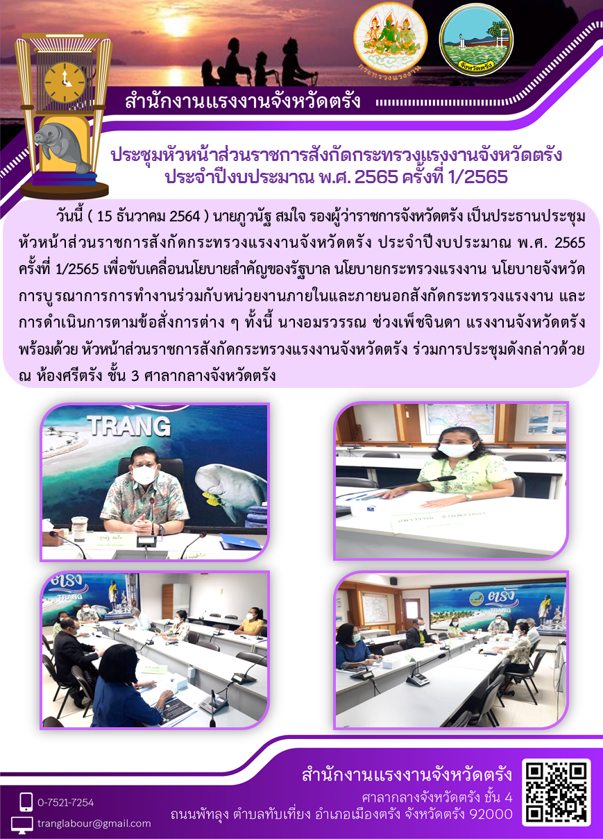 แรงงานจังหวัดตรัง จัดประชุมหัวหน้าส่วนราชการสังกัดกระทรวงแรงงานจังหวัดตรัง ประจำปีงบประมาณ พ.ศ. 2565 ครั้งที่ 1/2565