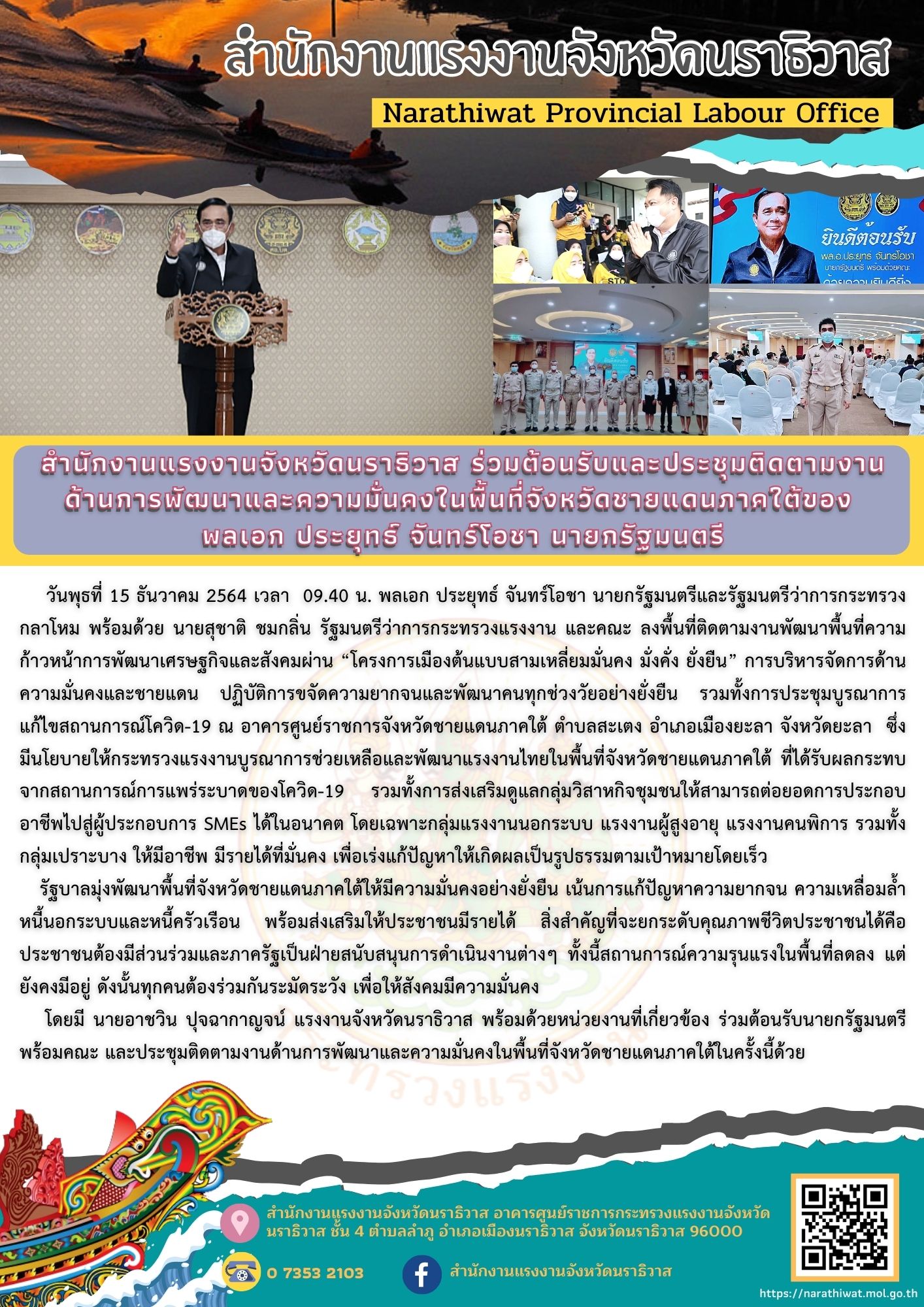 สำนักงานแรงงานจังหวัดนราธิวาส ร่วมต้อนรับและประชุมติดตามงานด้านการพัฒนาและความมั่นคงในพื้นที่จังหวัดชายแดนภาคใต้ของ พลเอก ประยุทธ์ จันทร์โอชา นายกรัฐมนตรี