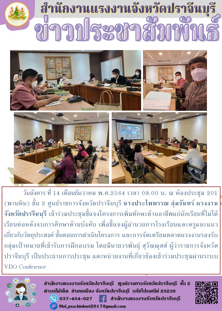แรงงานจังหวัดปราจีนบุรี เข้าร่วมประชุมชี้แจงโครงการเพิ่มทักษะด้านอาชีพแก่นักเรียนที่ไม่ได้เรียนต่อหลังจบการศึกษาด้านบังคับ