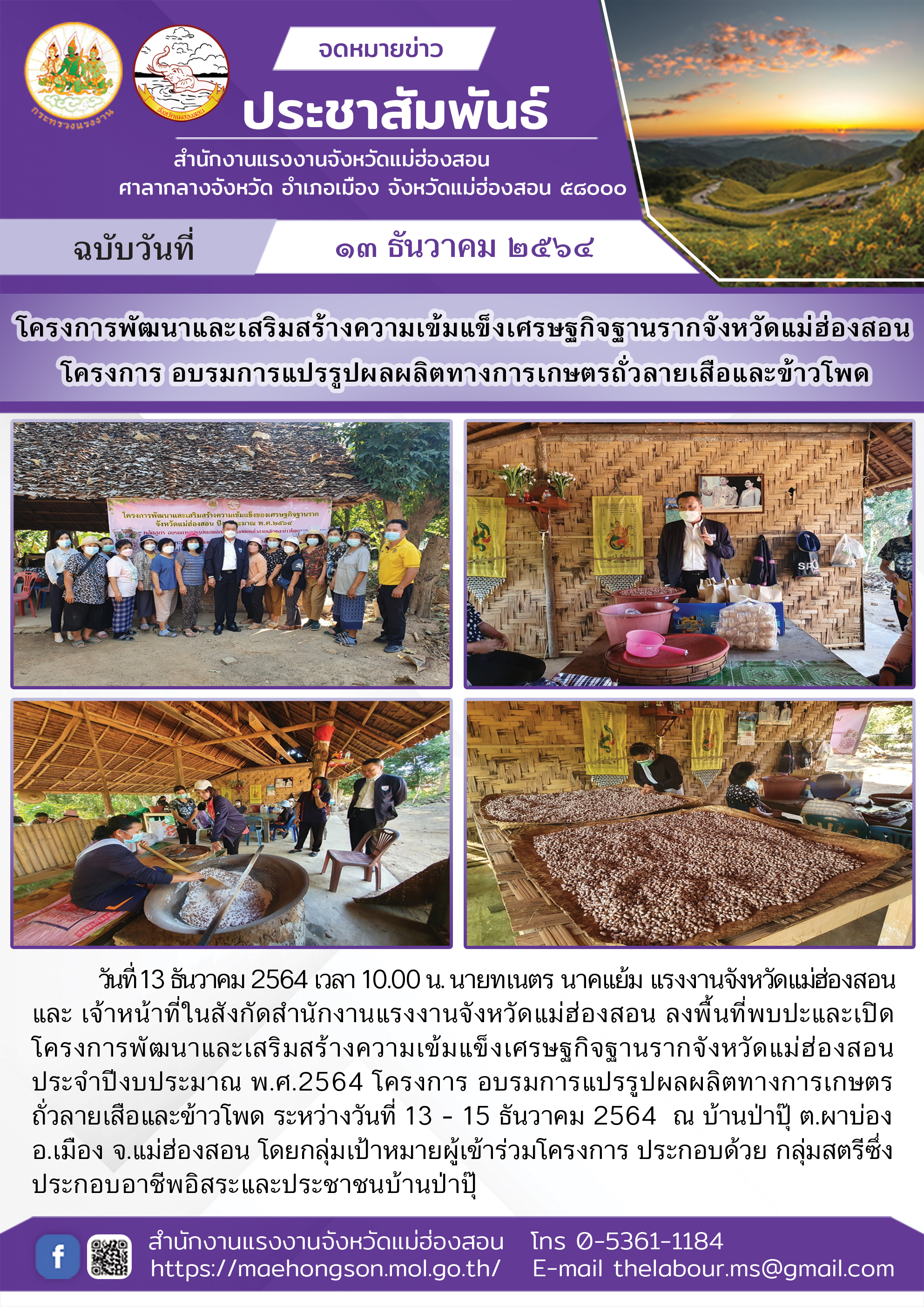 แรงงานจังหวัดแม่ฮ่องสอน ลงพื้นที่พบปะและเปิดโครงการอบรมการแปรรูปผลผลิตทางการเกษตรถั่วลายเสือและข้าวโพด