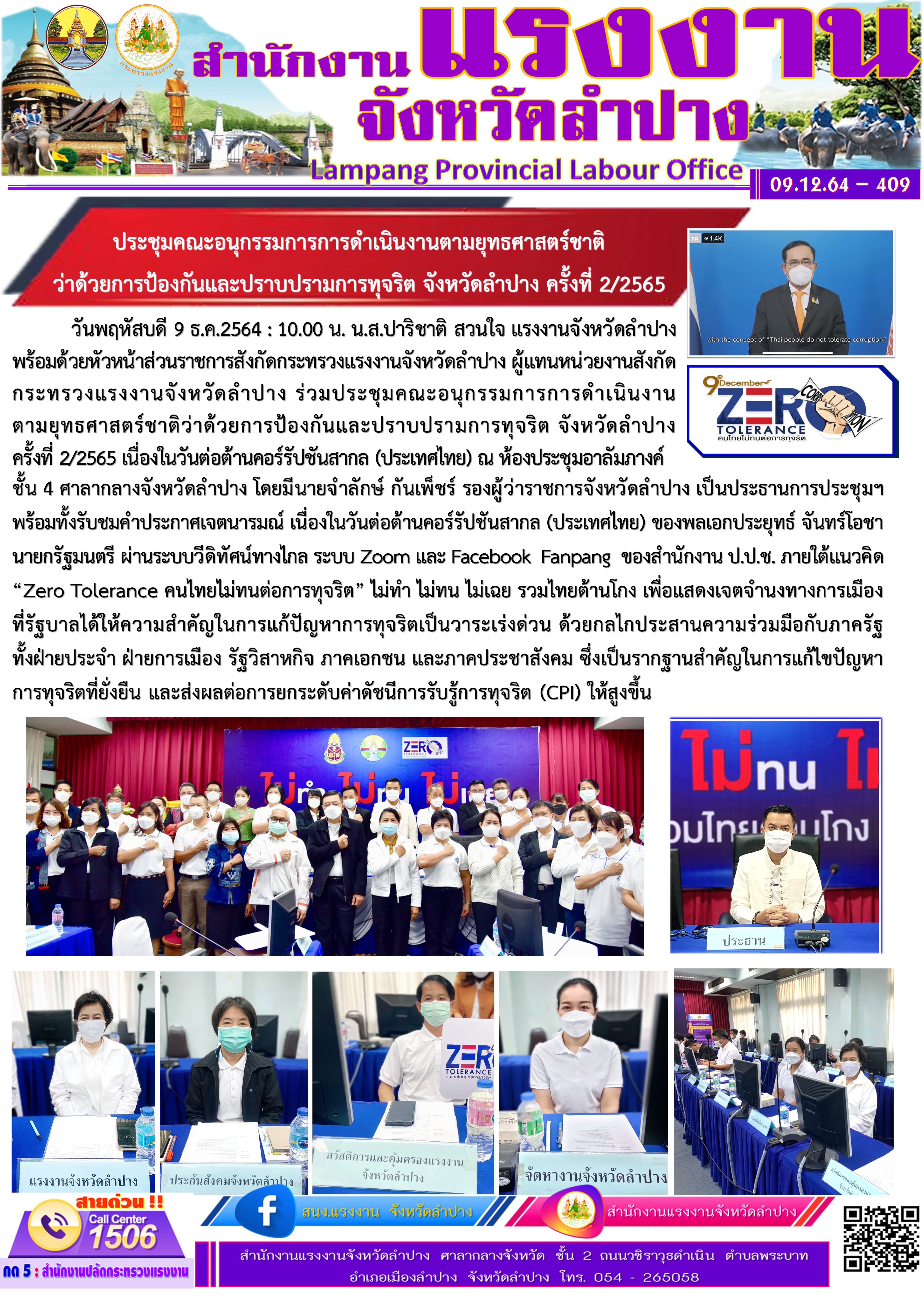 แรงงานจังหวัดลำปาง ร่วมประชุมคณะอนุกรรมการการดำเนินงานตามยุทธศาสตร์ชาติว่าด้วยการป้องกันและปราบปรามการทุจริต จังหวัดลำปาง ครั้งที่ 2/2565 เนื่องในวันต่อต้านคอร์รัปชันสากล (ประเทศไทย)