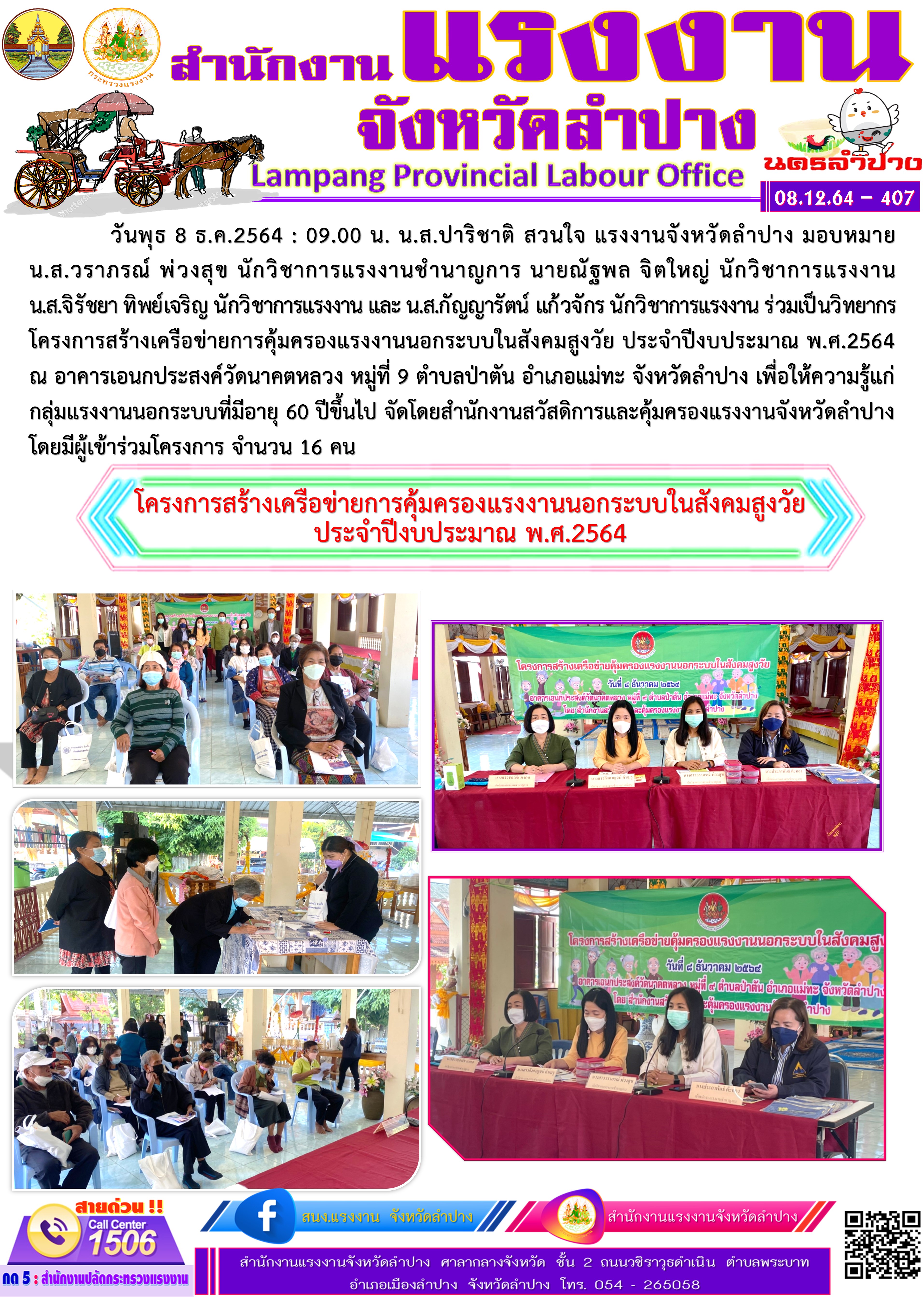สรจ.ลำปาง ร่วมเป็นวิทยากรร่วมโครงการสร้างเครือข่ายการคุ้มครองแรงงานนอกระบบในสังคมสูงวัย ประจำปีงบประมาณ พ.ศ. 2564