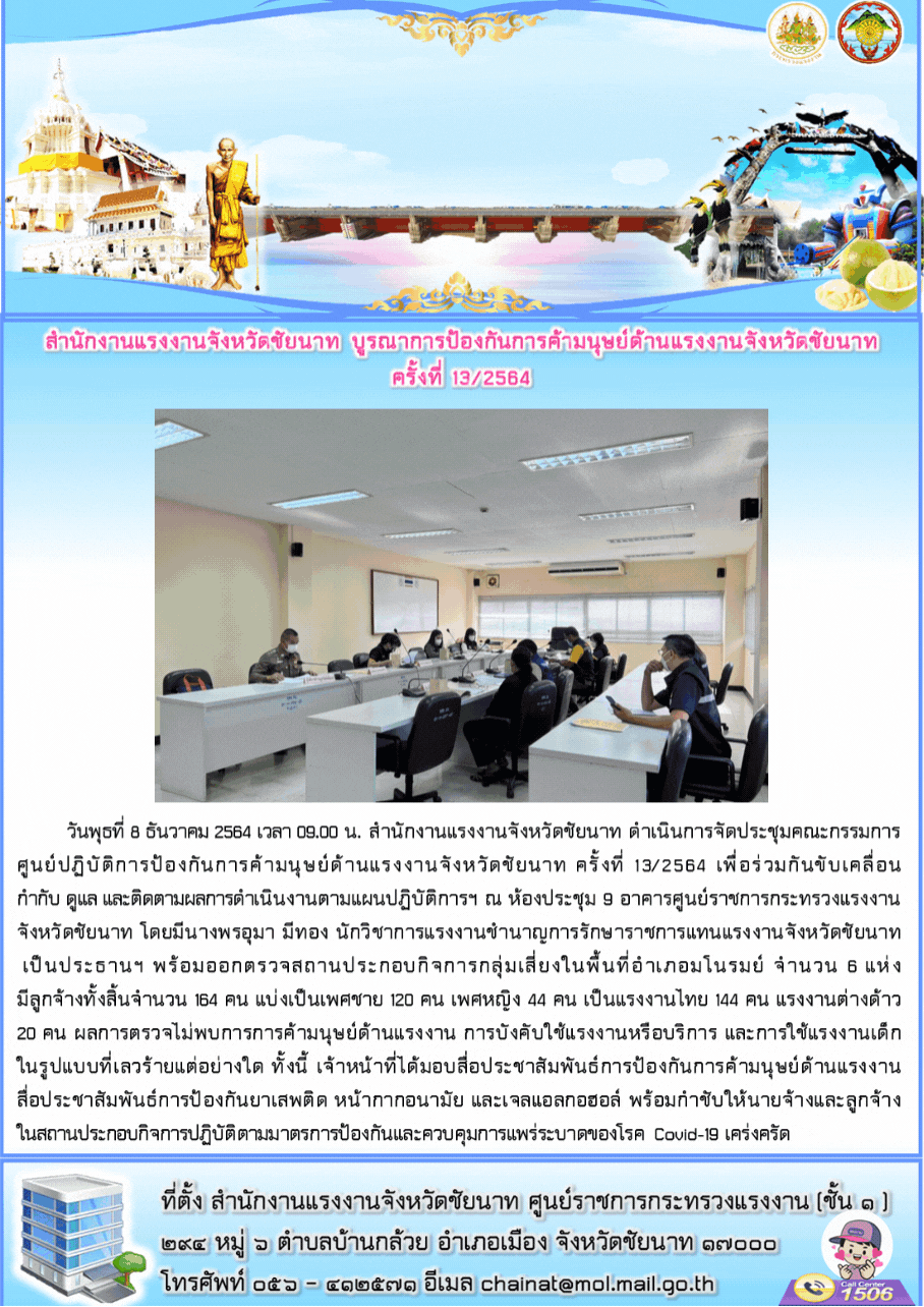 สำนักงานแรงงานจังหวัดชัยนาท จัดประชุมคณะกรรมการศูนย์ปฏิบัติการป้องกันการค้ามนุษย์ด้านแรงงานจังหวัดชัยนาท ครั้งที่ 13/2564