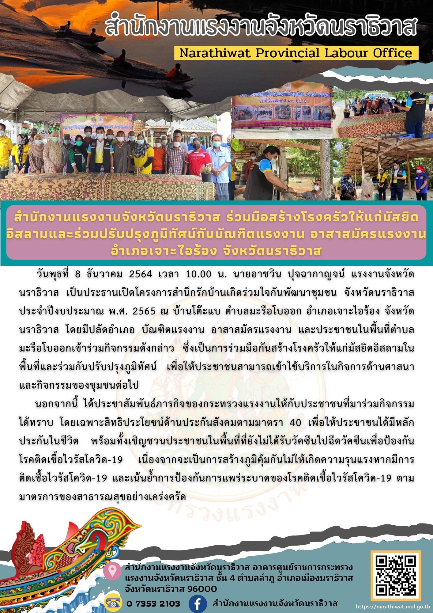 สำนักงานแรงงานจังหวัดนราธิวาส ร่วมมือสร้างโรงครัวให้แก่มัสยิดอิสลามและร่วมปรับปรุงภูมิทัศน์กับบัณฑิตแรงงาน อาสาสมัครแรงงาน อำเภอเจาะไอร้อง จังหวัดนราธิวาส