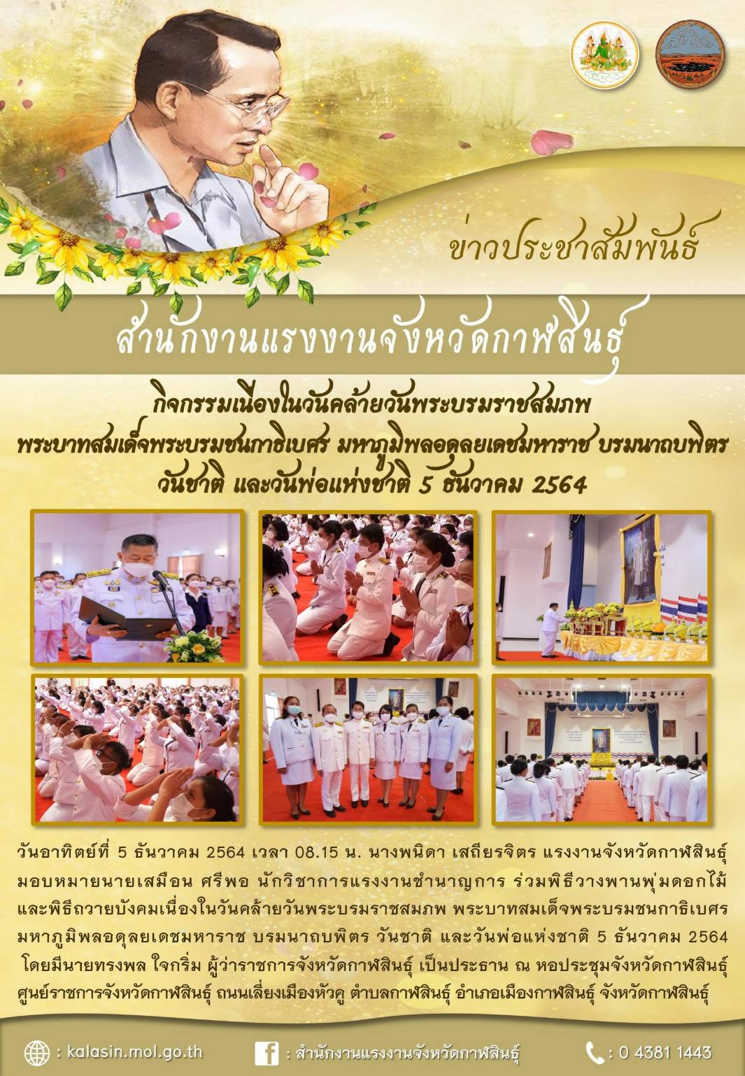สรจ.กาฬสินธุ์ พิธีวางพานพุ่มดอกไม้และพิธีถวายบังคม เนื่องในวันคล้ายวันพระบรมราชสมภพ พระบาทสมเด็จพระบรมชนกาธิเบศร มหาภูมิพลอดุลยเดชมหาราช บรมนาถบพิตร วันชาติ และวันพ่อแห่งชาติ 5 ธันวาคม 2564