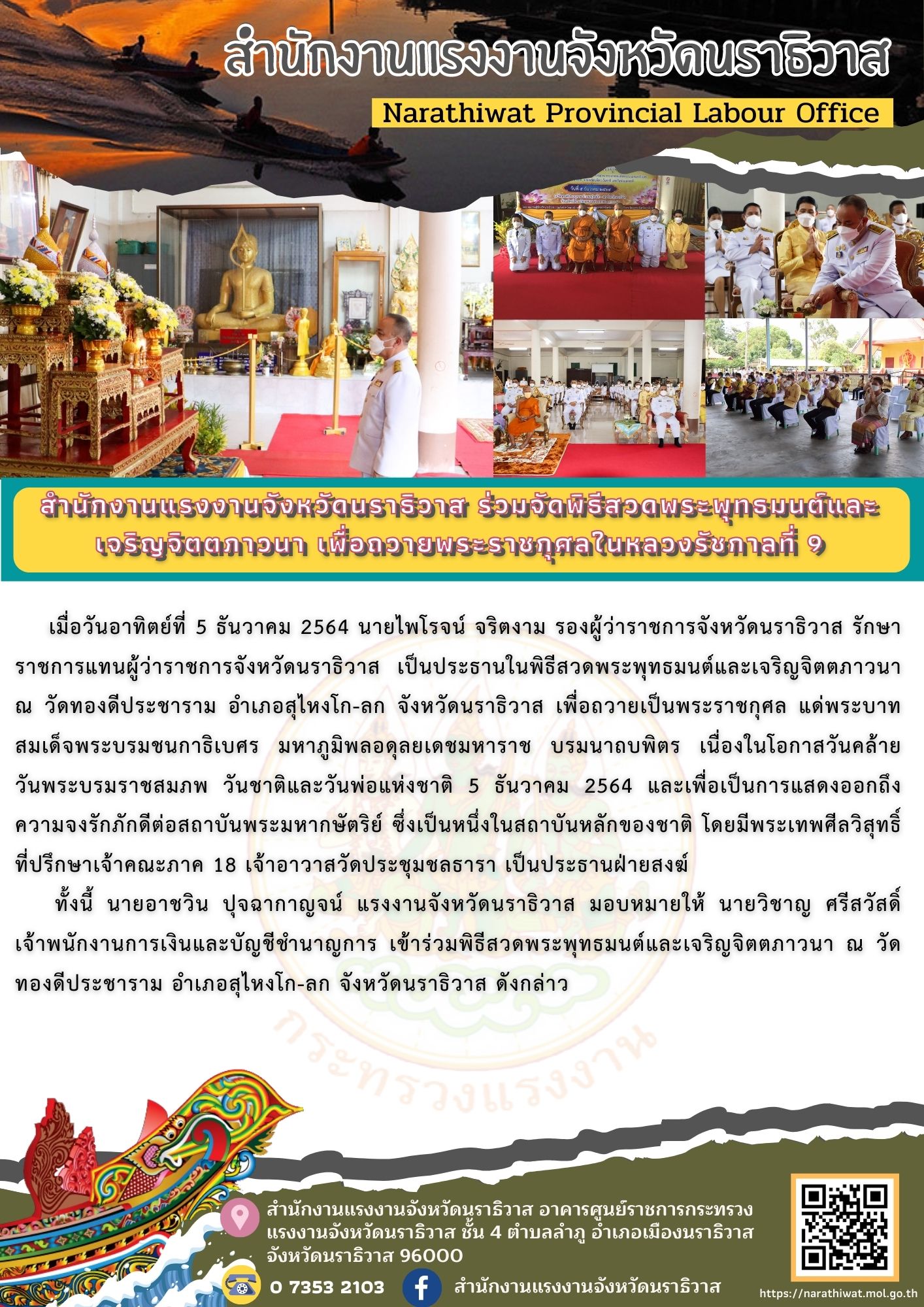 สำนักงานแรงงานจังหวัดนราธิวาส ร่วมจัดพิธีสวดพระพุทธมนต์และเจริญจิตตภาวนา เพื่อถวายพระราชกุศลในหลวงรัชกาลที่ 9