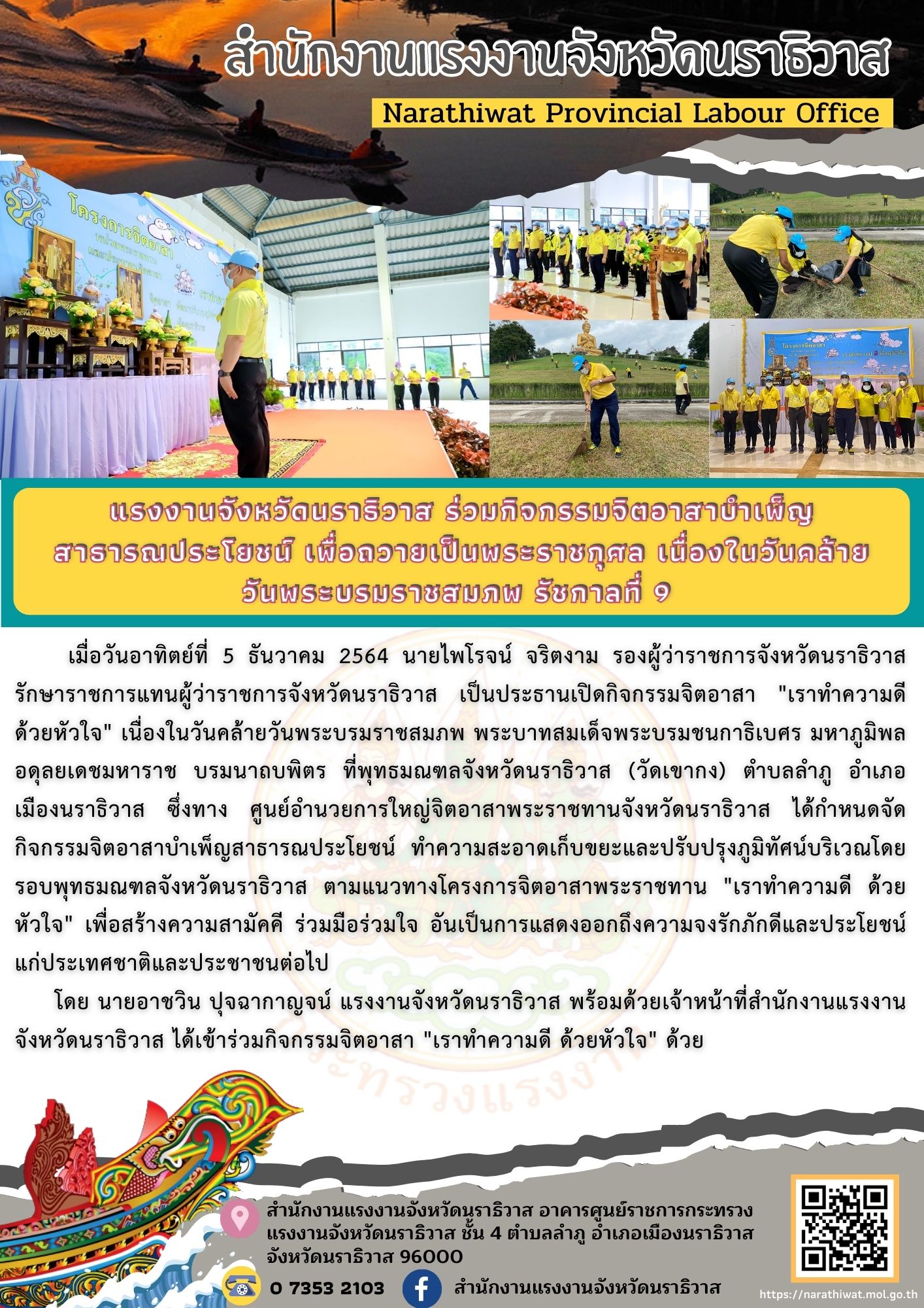 แรงงานจังหวัดนราธิวาส ร่วมกิจกรรมจิตอาสาบำเพ็ญสาธารณประโยชน์ เพื่อถวายเป็นพระราชกุศล เนื่องในวันคล้ายวันพระบรมราชสมภพ รัชกาลที่ 9