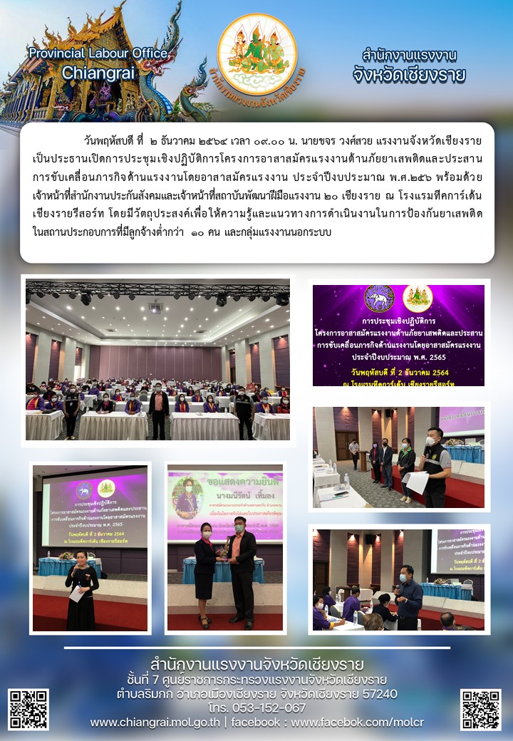 สรจ.เชียงราย จัดประชุมเชิงปฏิบัติการโครงการอาสาสมัครแรงงานต้านภัยยาเสพติดและประสานการขับเคลื่อนภารกิจด้านแรงงานโดยอาสาสมัครแรงงาน ประจำปีงบประมาณ พ.ศ.2565