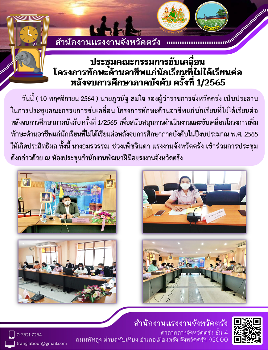 แรงงานจังหวัดตรัง ร่วมการประชุมคณะกรรมการขับเคลื่อนโครงการทักษะด้านอาชีพแก่นักเรียนที่ไม่ได้เรียนต่อ หลังจบการศึกษาภาคบังคับ ครั้งที่ 1/2565