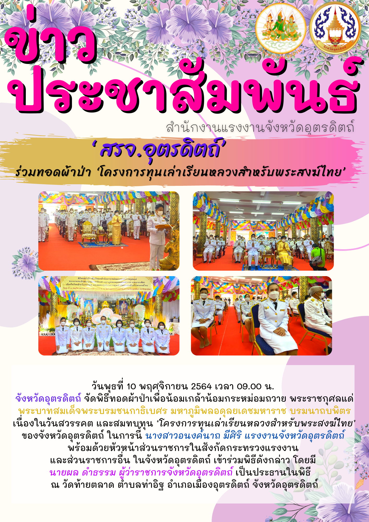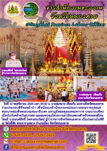 แรงงานจังหวัดหนองคาย ร่วมประกอบพิธีทอดผ้าป่า เพื่อน้อมเกล้าน้อมกระหม่อมถวายพระราชกุศลแด่ พระบาทสมเด็จพระบรมชนกาธิเบศร มหาภูมิพลอดุลยเดชมหาราช บรมนาถบพิตร เนื่องในวันคล้ายวันสวรรคต และสมทบทุนโครงการเล่าเรียนหลวงสำหรับพระสงฆ์ไทย