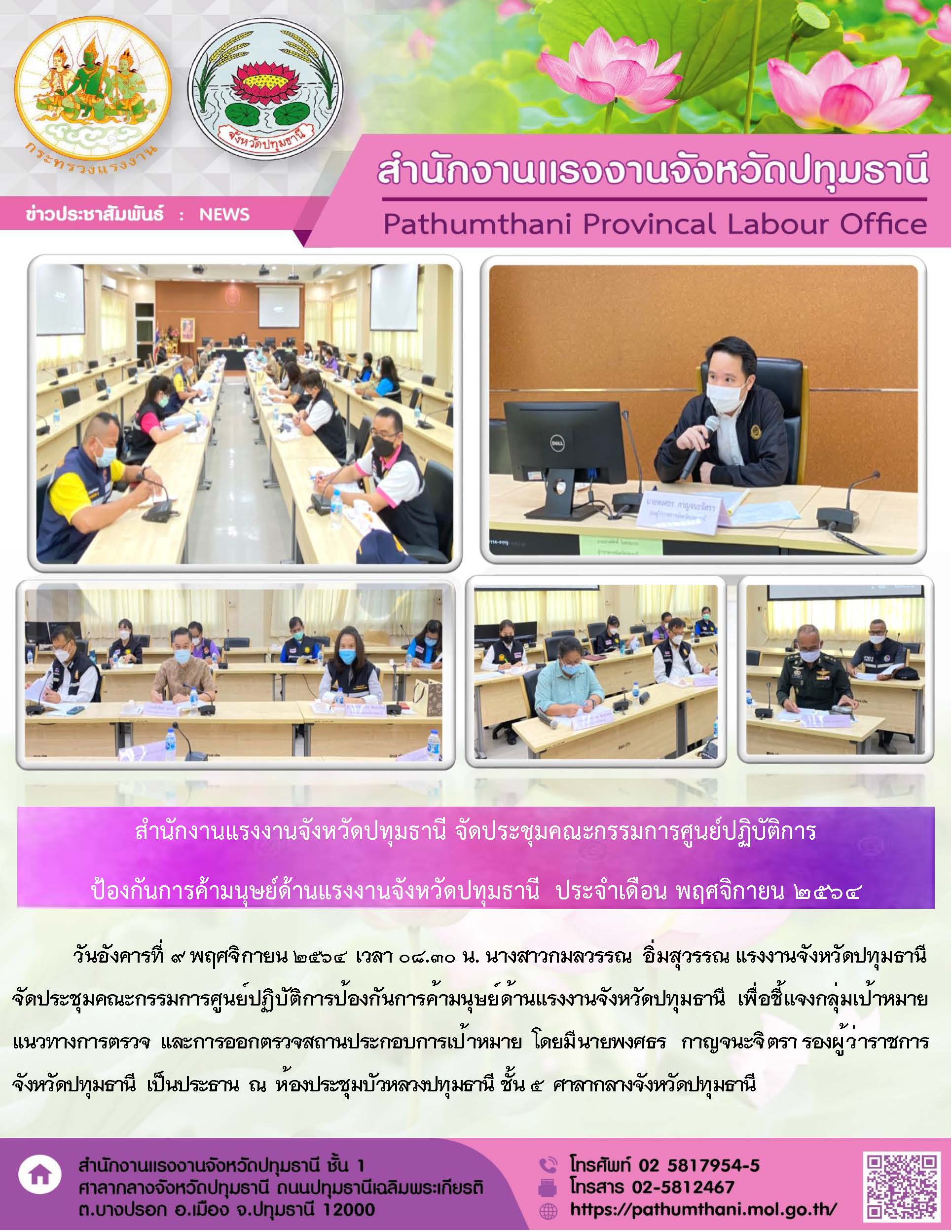 สำนักงานแรงงานจังหวัดปทุมธานี จัดประชุมคณะกรรมการศูนย์ปฏิบัติการป้องกันการค้ามนุษย์ด้านแรงงานจังหวัดปทุมธานี ประจำเดือนพฤศจิกายน ๒๕๖๔