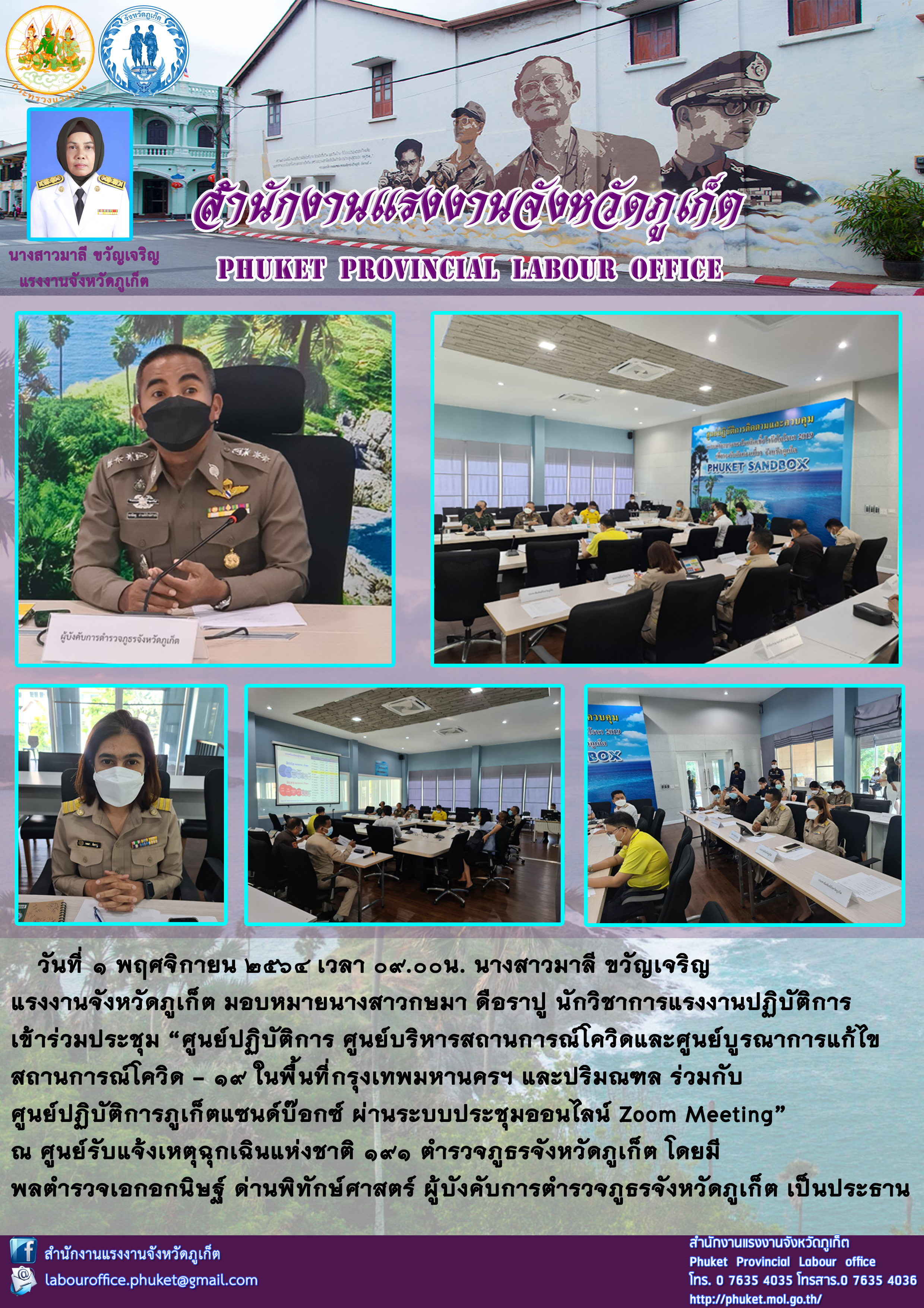 สำนักงานแรงงานจังหวัดภูเก็ต เข้าร่วมประชุม “ศูนย์ปฏิบัติการ ศูนย์บริหารสถานการณ์โควิดและศูนย์บูรณาการแก้ไข สถานการณ์โควิด – 19 ในพื้นที่กรุงเทพมหานครฯ และปริมณฑล ร่วมกับ ศูนย์ปฏิบัติการภูเก็ตแซนด์บ๊อกซ์ ผ่านระบบประชุมออนไลน์ Zoom Meeting”
