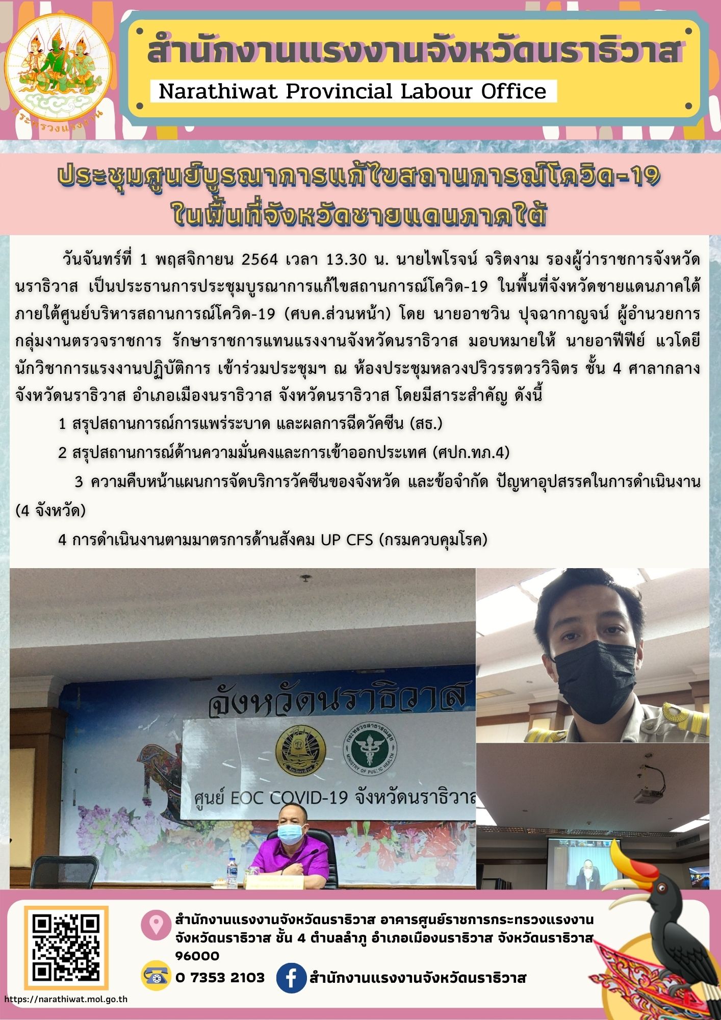 สำนักงานแรงงานจังหวัดนราธิวาส เข้าร่วมประชุมศูนย์บูรณาการแก้ไขสถานการณ์โควิด-19 ในพื้นที่จังหวัดชายแดนภาคใต้