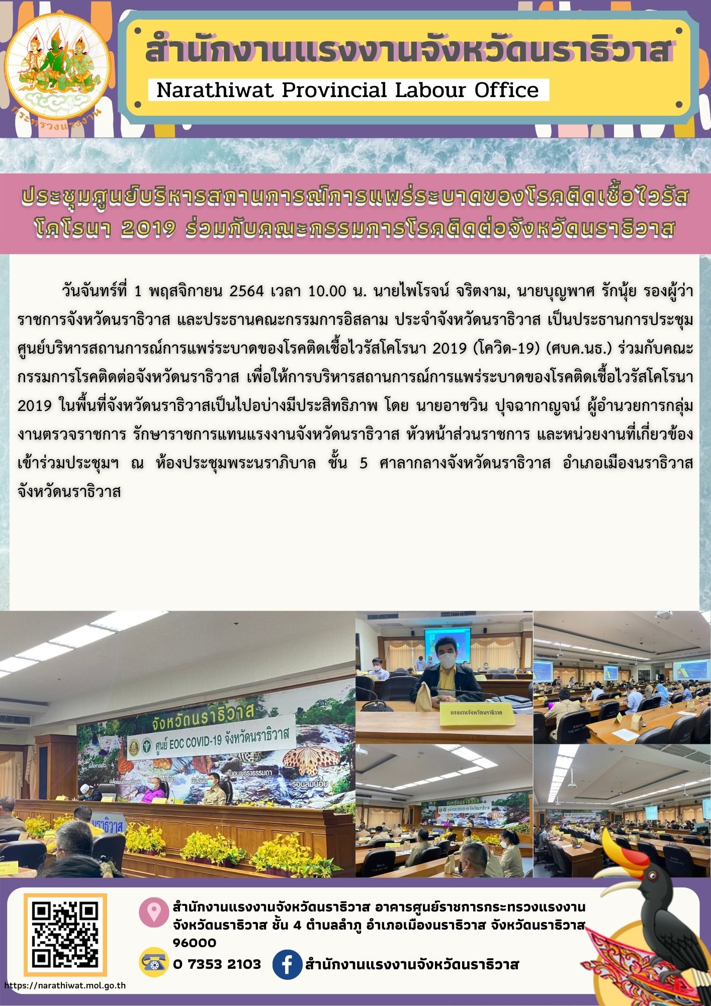 แรงงานจังหวัดนราธิวาส ประชุมศูนย์บริหารสถานการณ์การแพร่ระบาดของโรคติดเชื้อไวรัสโคโรนา 2019 ร่วมกับคณะกรรมการโรคติดต่อจังหวัดนราธิวาส