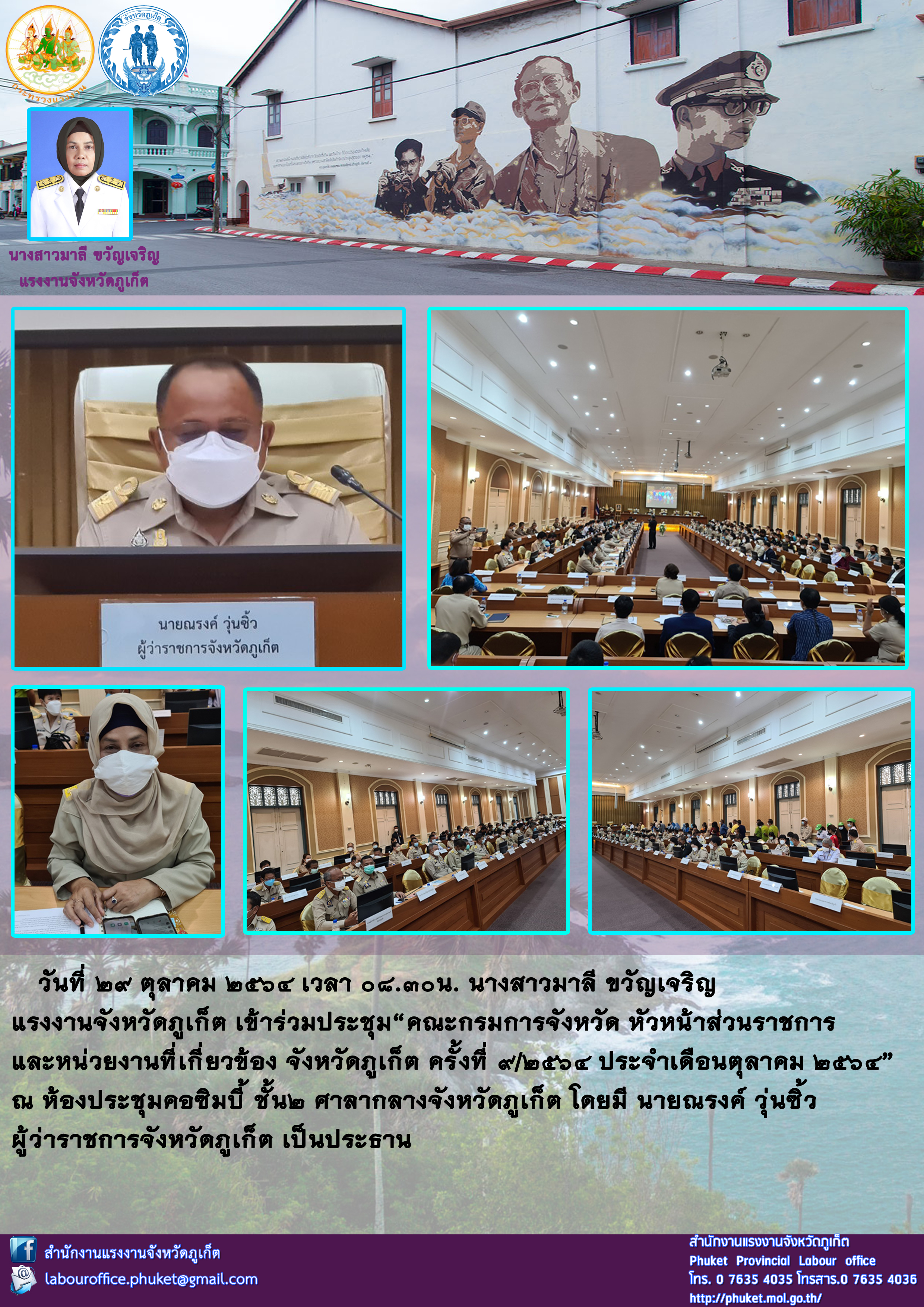 สำนักงานแรงงานจังหวัดภูเก็ต เข้าร่วมประชุม“คณะกรมการจังหวัด หัวหน้าส่วนราชการ และหน่วยงานที่เกี่ยวข้อง จังหวัดภูเก็ต ครั้งที่ 9/2564 ประจำเดือนตุลาคม 2564”
