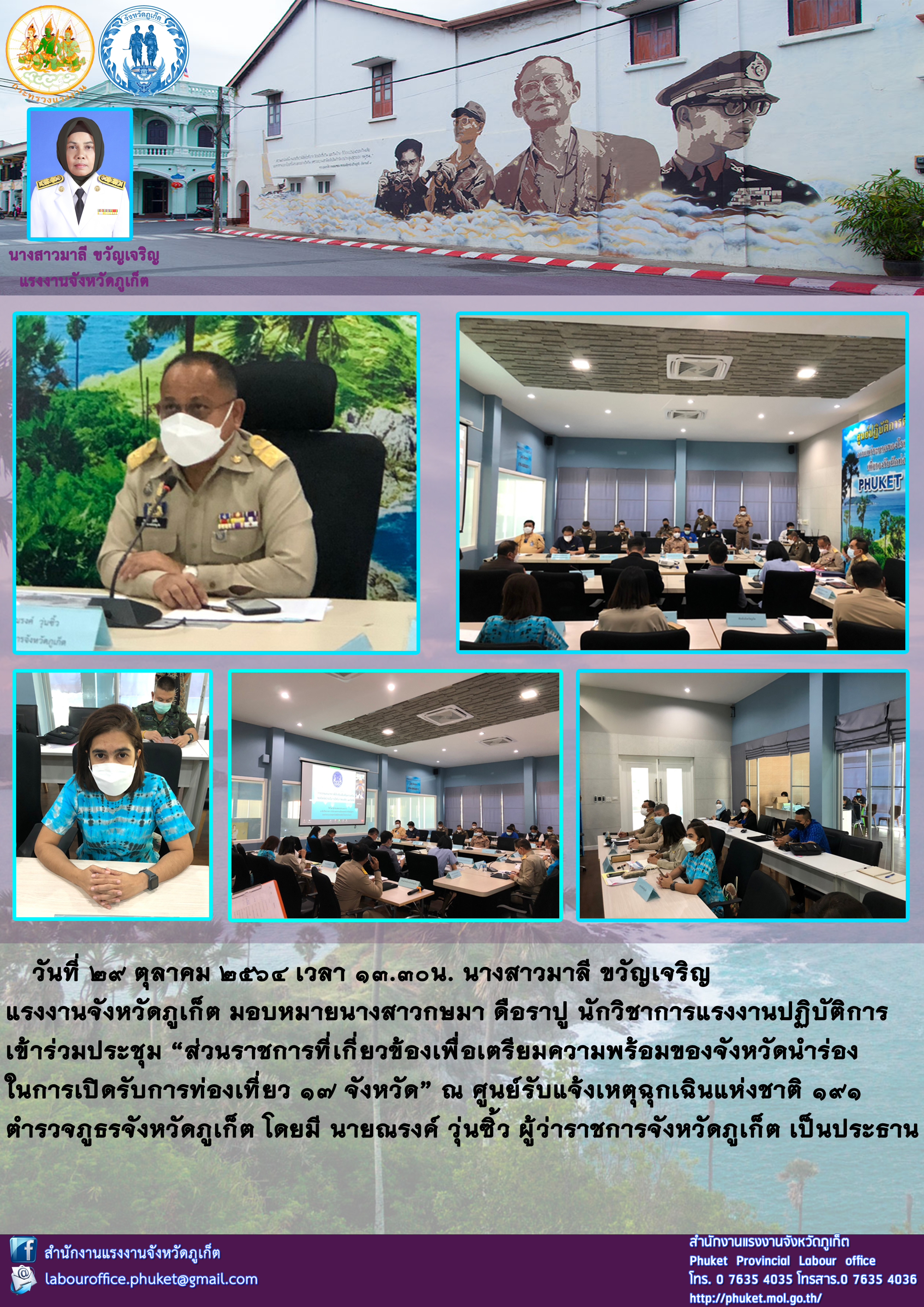 นางสาวมาลี ขวัญเจริญ แรงงานจังหวัดภูเก็ต มอบหมายนางสาวกษมา ดือราปู นักวิชาการแรงงานปฏิบัติการ เข้าร่วมประชุม “ส่วนราชการที่เกี่ยวข้องเพื่อเตรียมความพร้อมของจังหวัดนำร่อง ในการเปิดรับการท่องเที่ยว 17 จังหวัด”