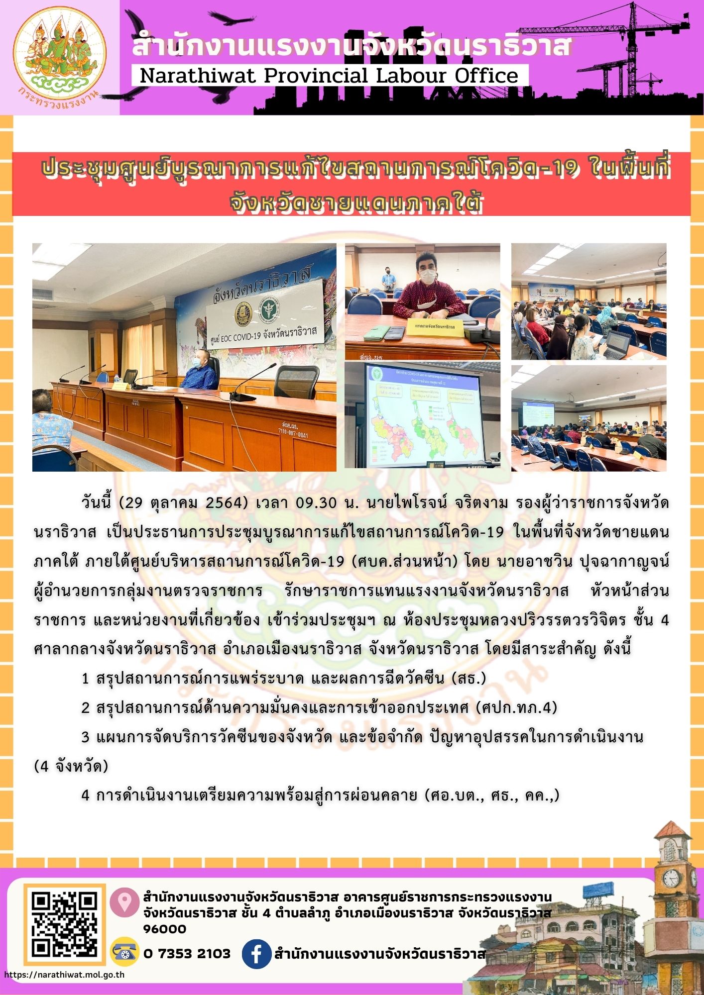 แรงงานจังหวัดนราธิวาส เข้าร่วมประชุมประชุมศูนย์บูรณาการแก้ไขสถานการณ์โควิด-19 ในพื้นที่จังหวัดชายแดนภาคใต้