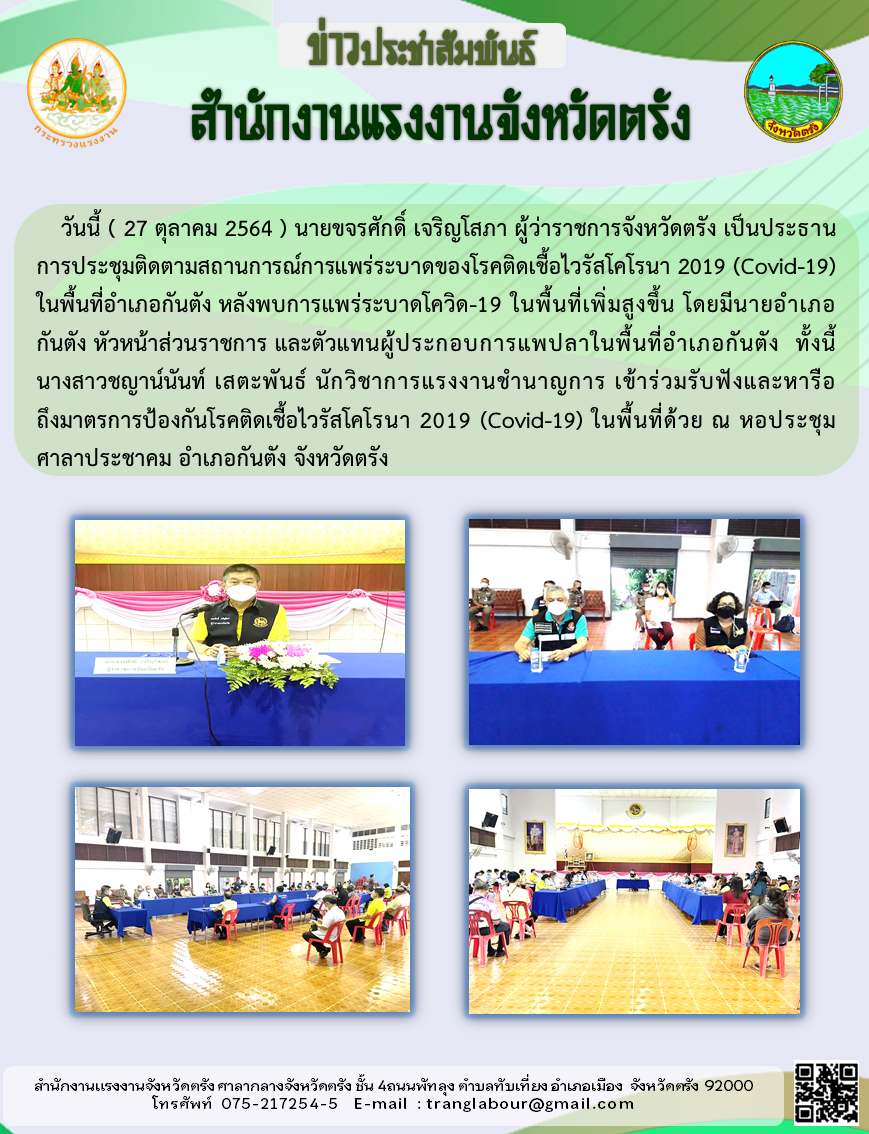 แรงงานจังหวัดตรัง ลงพื้นที่ติดตามสถานการณ์การแพร่ระบาดของโรคติดเชื้อไวรัสโคโรนา 2019 (Covid-19) ในพื้นที่อำเภอกันตัง หลังพบการแพร่ระบาดโควิด-19