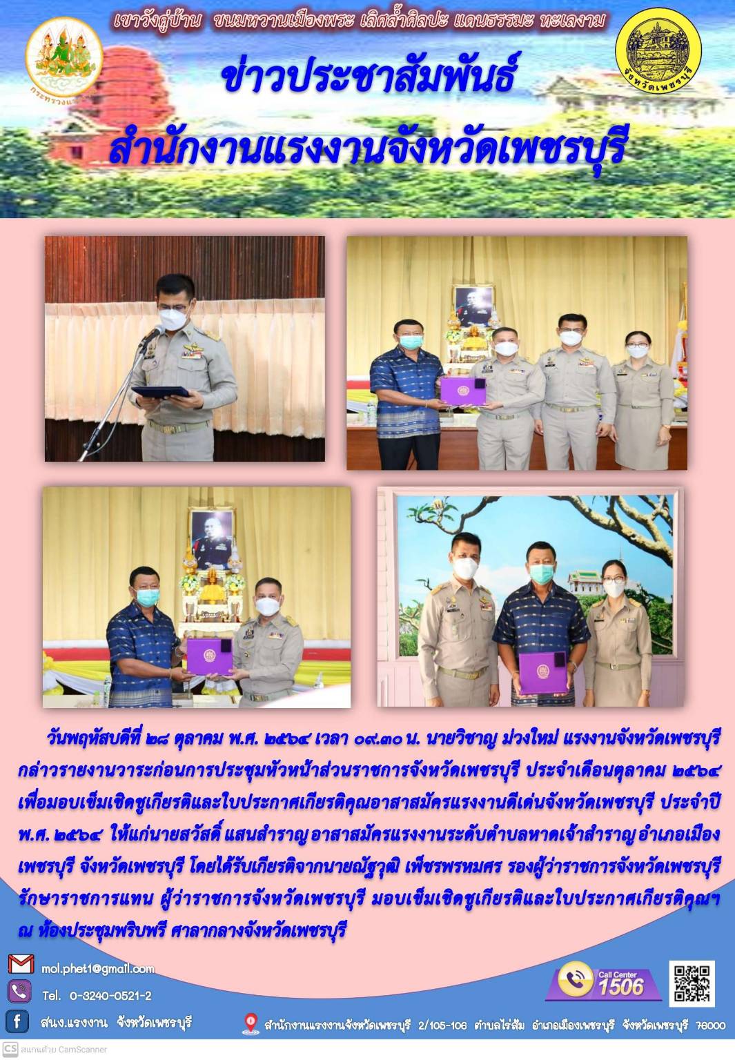 แรงงานจังหวัดเพชรบุรี มอบเข็มเชิดชูเกียรติและใบประกาศเกียรติคุณอาสาสมัครแรงงานดีเด่นจังหวัดเพชรบุรี ประจำปี พ.ศ. 2564