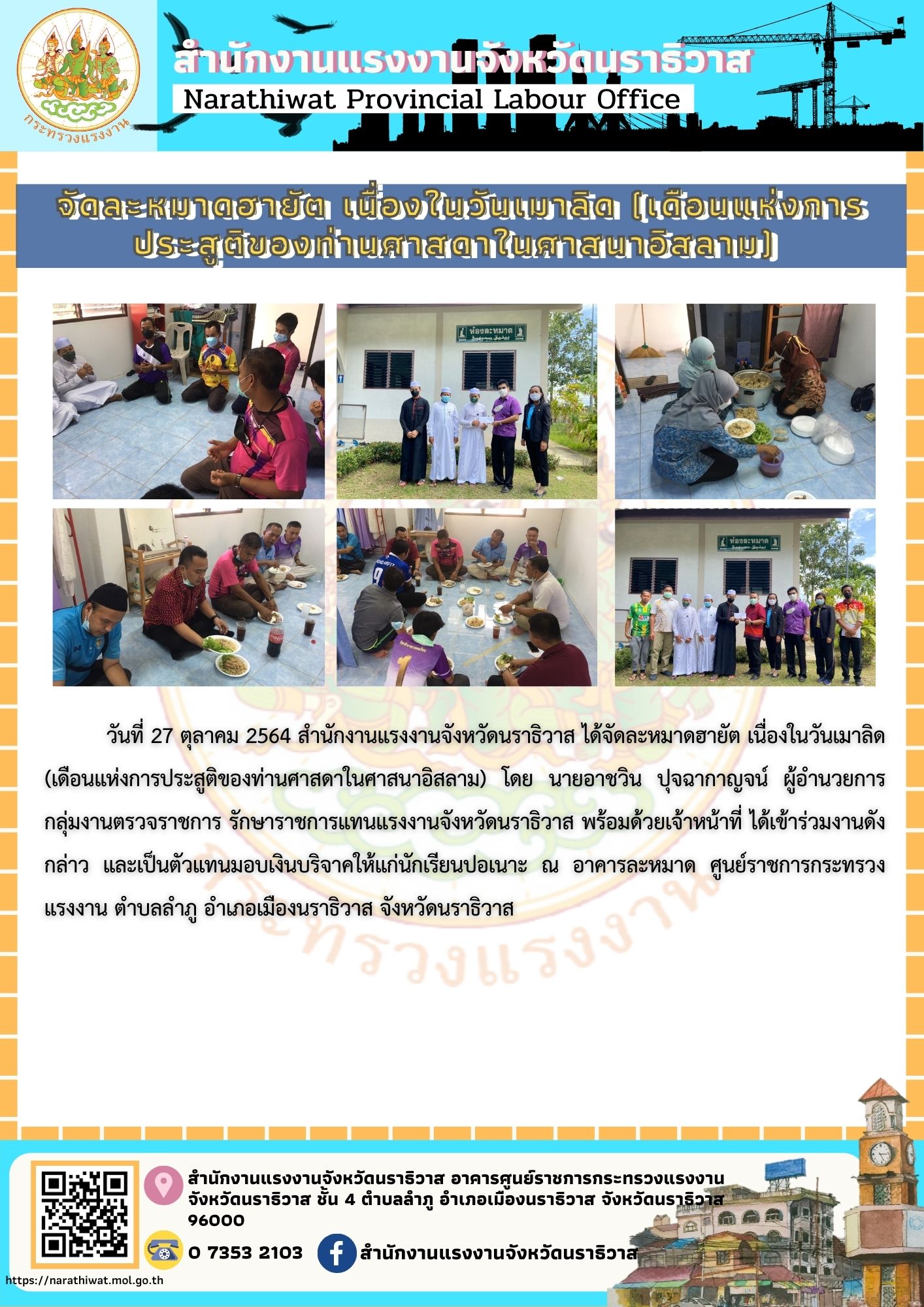 สำนักงานแรงงานจังหวัดนราธิวาส ได้จัดละหมาดฮายัต เนื่องในวันเมาลิด (เดือนแห่งการประสูติของท่านศาสดาในศาสนาอิสลาม)