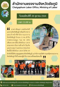 แรงงานจังหวัดชัยภูมิ พร้อมข้าราชการและเจ้าหน้าที่สำนักงานแรงงาน จังหวัดชัยภูมิ จำนวน 11 คน เข้ารับการตรวจ Antigen Test Kit (ATK) เพื่อตรวจหาเชื้อไวรัสโคโรนา 2019 ตามมาตรการในการเฝ้าระวัง ป้องกัน และควบคุมการแพร่ระบาดของโรคติดเชื้อไวรัสโคโรนา 2019 (โควิด-19) สำหรับพื้นที่ควบคุมสูงสุดของจังหวัดชัยภูมิ ณ สำนักงานสวัสดิการและคุ้มครองแรงงานจังหวัดชัยภูมิ ทั้งนี้ ผลของผู้เข้ารับการตรวจทั้งหมดไม่พบเชื้อ
