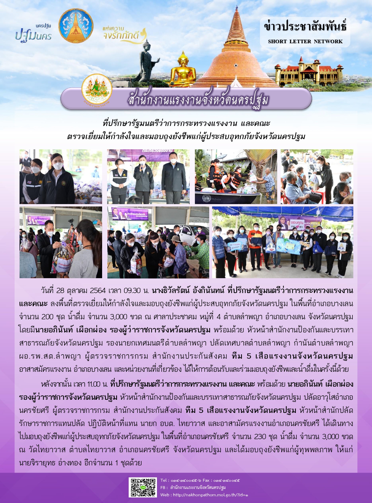 ที่ปรึกษารัฐมนตรีว่าการกระทรวงแรงงาน และคณะ ตรวจเยี่ยมให้กำลังใจและมอบถุงยังชีพแก่ผู้ประสบอุทกภัยจังหวัดนครปฐม