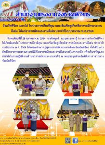 จังหวัดพิจิตร มอบโล่ ใบประกาศเกียรติคุณ และเข็มเชิดชูเกียรติอาสาสมัครแรงงานดีเด่น ให้แก่อาสาสมัครแรงงานดีเด่น ประจำปีงบประมาณ พ.ศ.2564