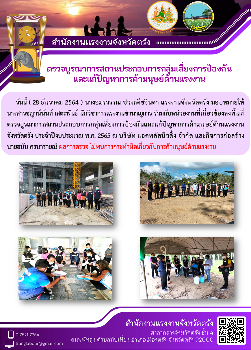 แรงงานจังหวัดตรัง มอบหมายให้ นางสาวชญาน์นันท์ เสตะพันธ์ นักวิชาการแรงงานชำนาญการ ร่วมกับหน่วยงานที่เกี่ยวข้องลงพื้นที่ตรวจบูรณาการสถานประกอบการกลุ่มเสี่ยงการป้องกันและแก้ปัญหาการค้ามนุษย์ด้านแรงงาน จังหวัดตรัง