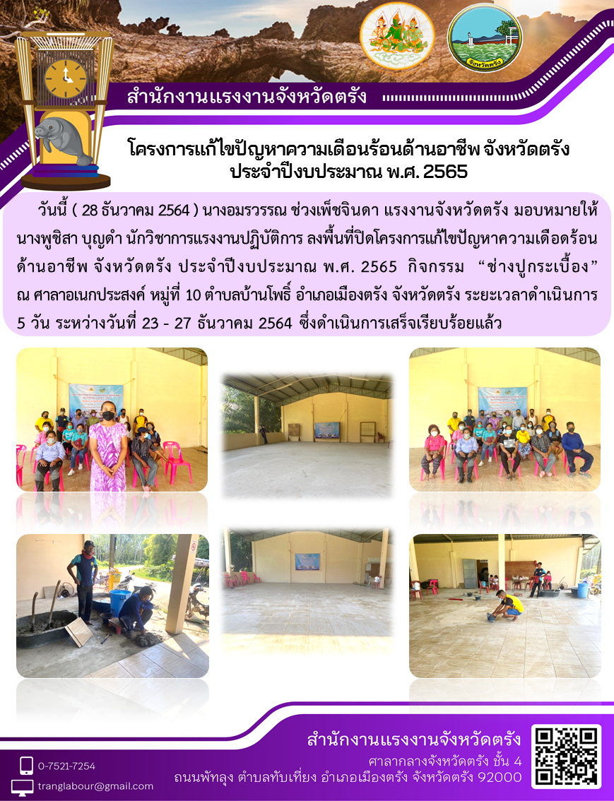 แรงงานจังหวัดตรัง มอบหมายให้ นางพูชิสา บุญดำ นักวิชาการแรงงานปฏิบัติการ ลงพื้นที่ปิดโครงการแก้ไขปัญหาความเดือดร้อนด้านอาชีพ จังหวัดตรัง ประจำปีงบประมาณ พ.ศ. 2565 กิจกรรม “ช่างปูกระเบื้อง”