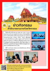 การประชุมชี้แจงทำความเข้าใจหลักเกณฑ์มาตรฐานศูนย์ราชการสะดวก (Government Easy Contact Center : GECC) เพื่อกระตุ้นการส่งเสริมให้หน่วยงานมีความรู้ความเข้าใจเกี่ยวกับ ศูนย์ราชการสะดวก การให้บริการที่เป็นไปตามนโยบายของนายกรัฐมนตรี และมีมาตรฐานเดียวกัน เพื่อนำไปสู่การพัฒนาการเข้าถึงบริการ และขอรับรองมาตรฐานการให้บริการของศูนย์ราชการสะดวก ประจำปีงบประมาณ พ.ศ. 2565